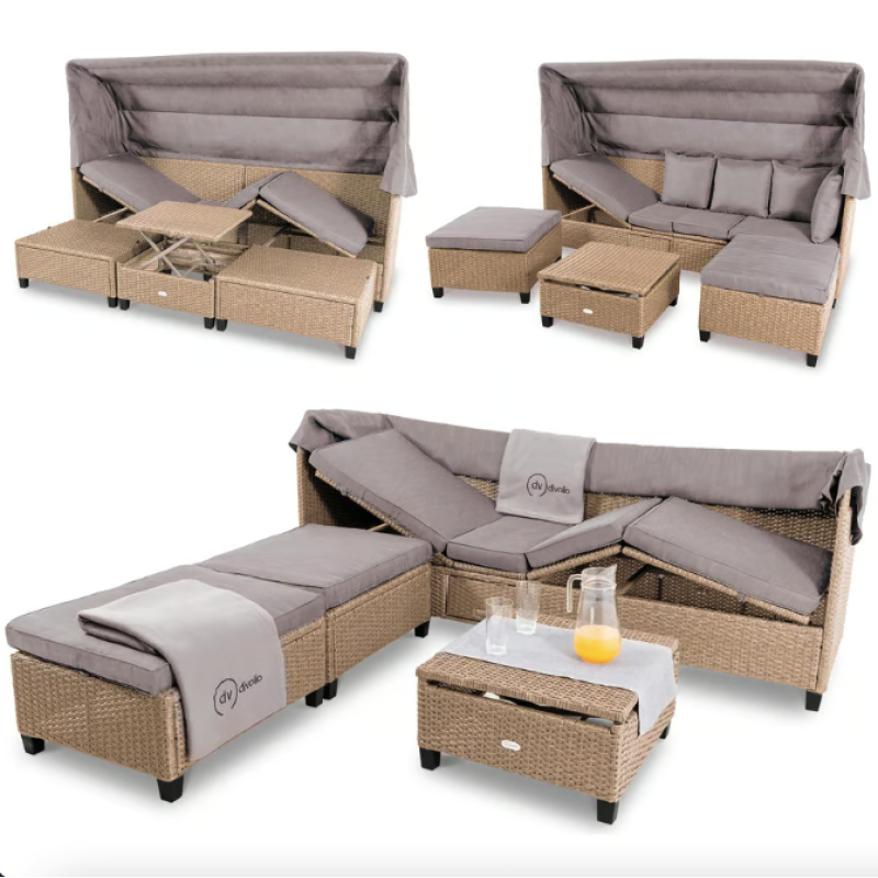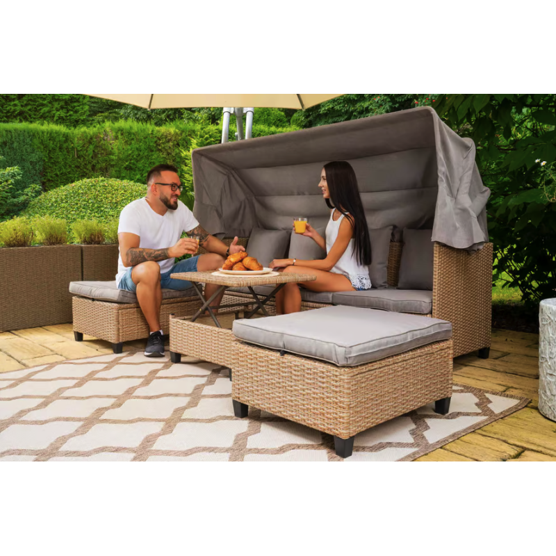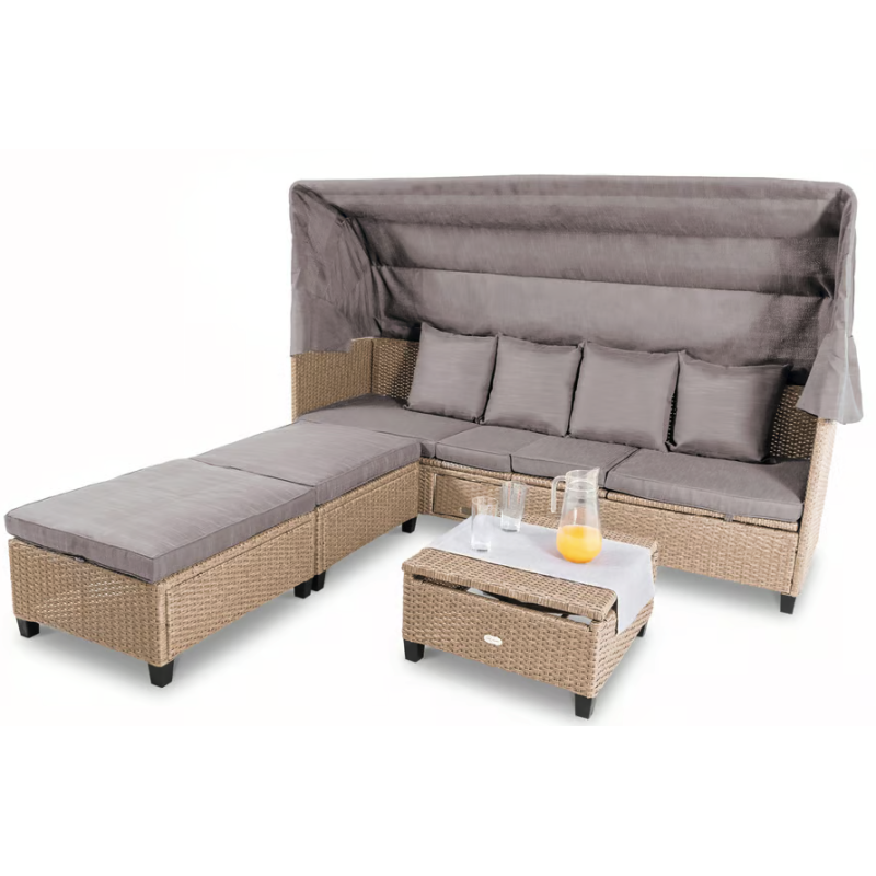 Luca от Di Volio - это набор мягкой мебели, благодаря которому вы прекрасно отдохнете на природе с друзьями и семьей. Идеально подходит для сада или большой террасы. Комплект состоит из 4-местного дивана, двух пуфов и невысокого столика. Диван защищен стенками и навесом - отдыхать можно даже в ветреную погоду. Мебель Luca изготовлена из высококачественного плетеного искусственного ротанга на стальном каркасе. Такая конструкция гарантирует, что мебель будет функциональной и удобной. Диван и пуфы укомплектованы мягкими удобными подушками. Цвет ротанга в этом наборе подобен цвету натурального ротанга - бежевый оттенок подойдет и для скандинавского стиля, и для стиля бохо, а также для балконов и террас, оформленных в классическом стиле.
