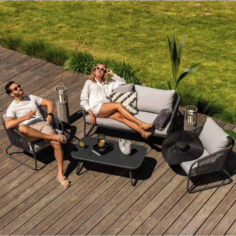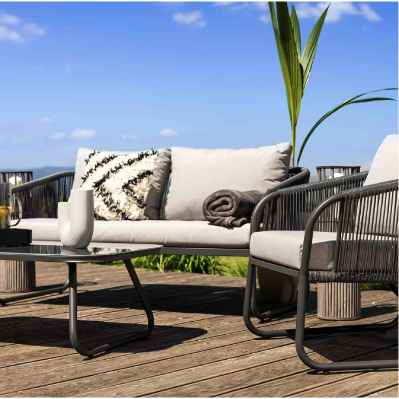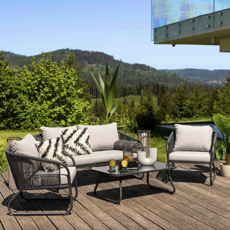 Садовая мебель Paso от Di Volio - это идеальное сочетание функциональности и современного стиля. Комплект состоит из просторного двухместного дивана и двух кресел, сиденья и спинки которых оснащены мягкими толстыми подушками, журнального столика со стеклянной столешницей. Мебельная конструкция, изготовленная из гнутых стальных труб графитового цвета и ручного плетения техноротанга того же оттенка, очень прочная, стабильная и, прежде всего, устойчива к внешним погодным факторам, таким как дождь, интенсивное солнце (УФ-лучи), снег или влажная. Простые, модернистские формы мебели и сдержанные цвета делают гарнитур Paso отличным практически в любой композиции, а ваш сад или терраса станут вашим излюбленным местом отдыха на природе.