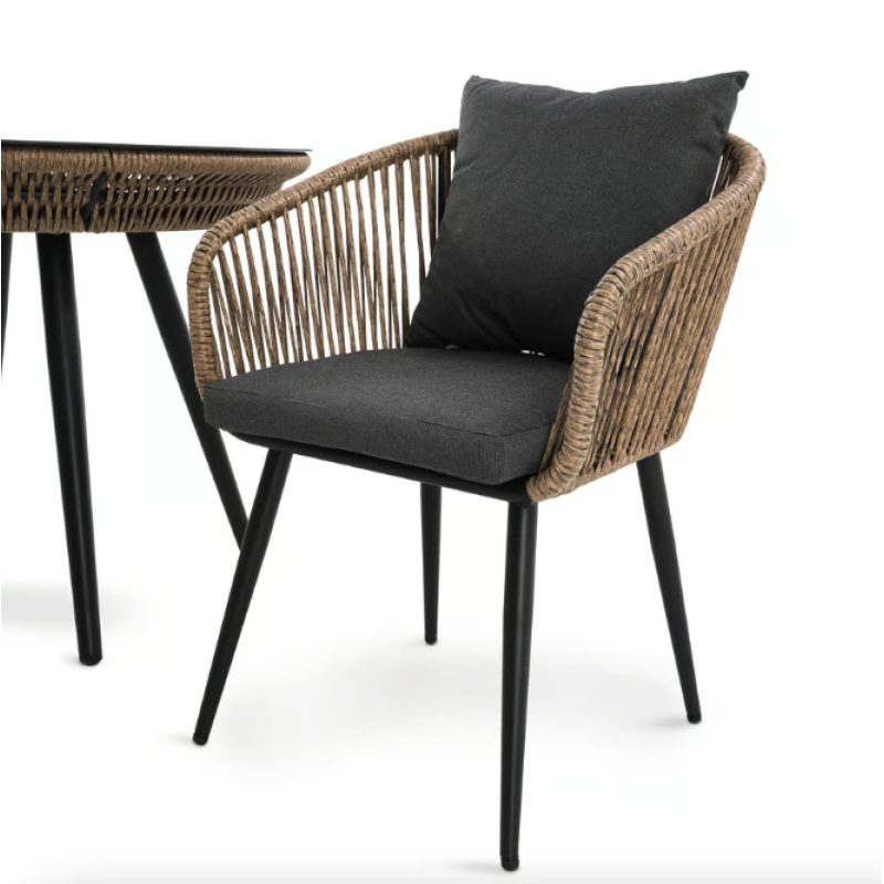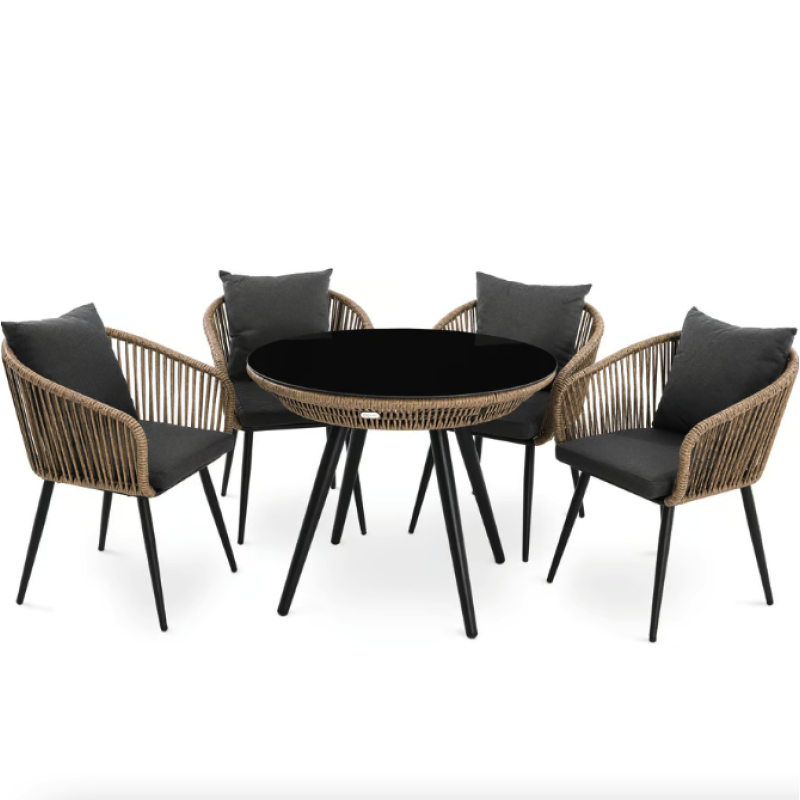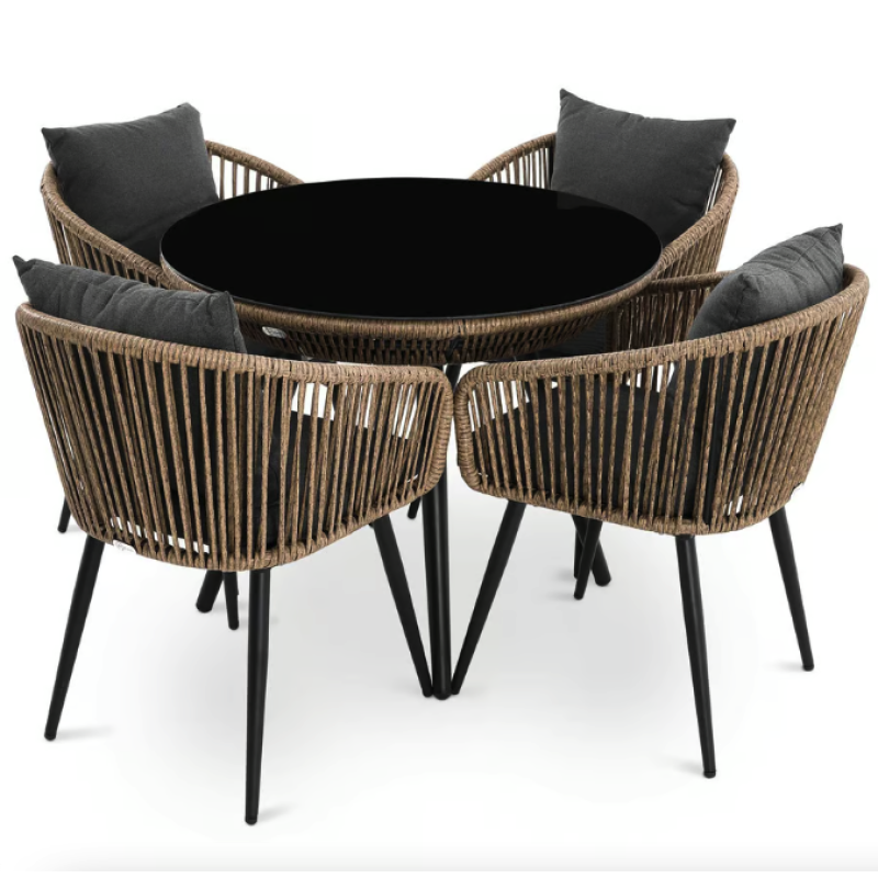 Комплект садовой мебели Rieti четырехместный позволит создать элегантное пространство для отдыха на природе. Комплект состоит из четырех удобных кресел с закругленной спинкой и круглого журнального столика со столешницей из закаленного стекла. Для мебели Rieti характерна точная работа и использование высококачественных материалов, устойчивых к погодным условиям - оцинкованной стали и техноротанга ручного плетения. Сочетание прочной черной стальной конструкции с плетением из техноротанга в натуральном бежевом оттенке придает мебели уникальный современный характер, благодаря чему они идеально впишутся в модные террасы и садовые композиции, например, в стиле лофт или скандинавском стиле.