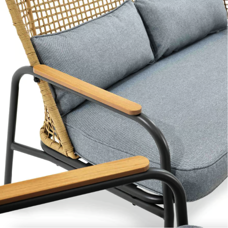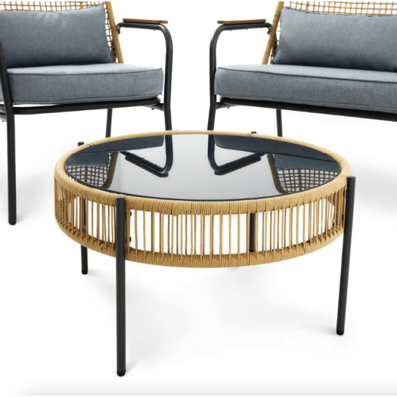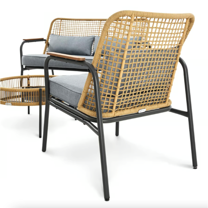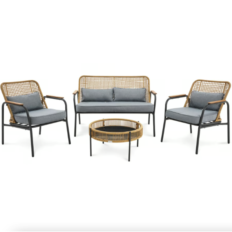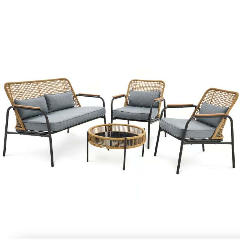 Набор садовой мебели Salerno - идеальное решение для вашего открытого пространства. Четырехместный комплект, состоящий из просторного двухместного дивана, двух удобных кресел с подлокотниками и круглого журнального столика, позволяет приятно и комфортно провести время в саду и на террасе. Мебель отличается своим стильным дизайном, сочетающим в себе лучшие черты скандинавского стиля и стиля лофт, то есть функциональность, простоту форм и сдержанные цвета. Современные материалы - техноротанг, сталь и поливуд - обеспечивают устойчивость мебели к разным погодным условиям, благодаря чему все элементы мебели для террасы сохранят прочность и эстетичный вид в течение многих лет использования.