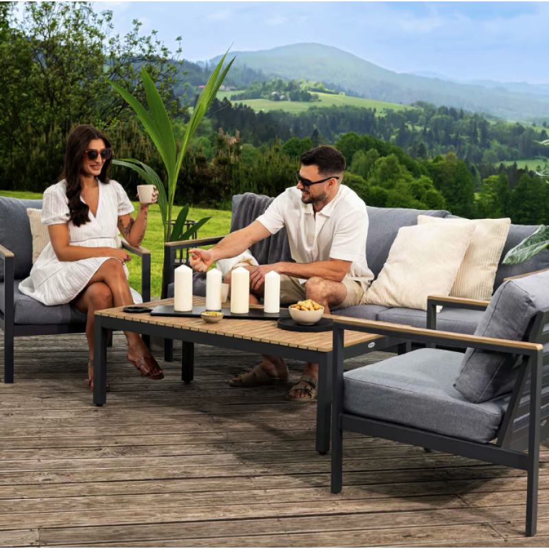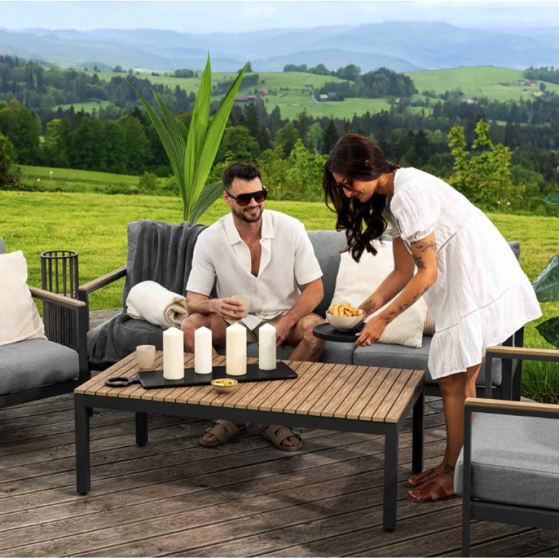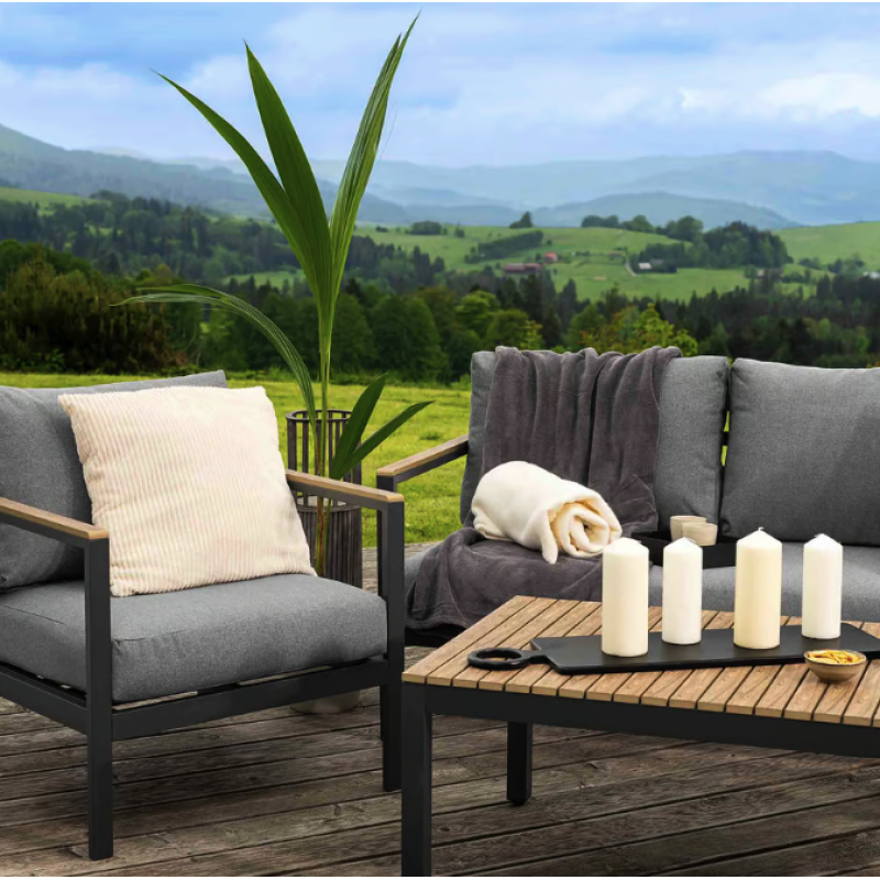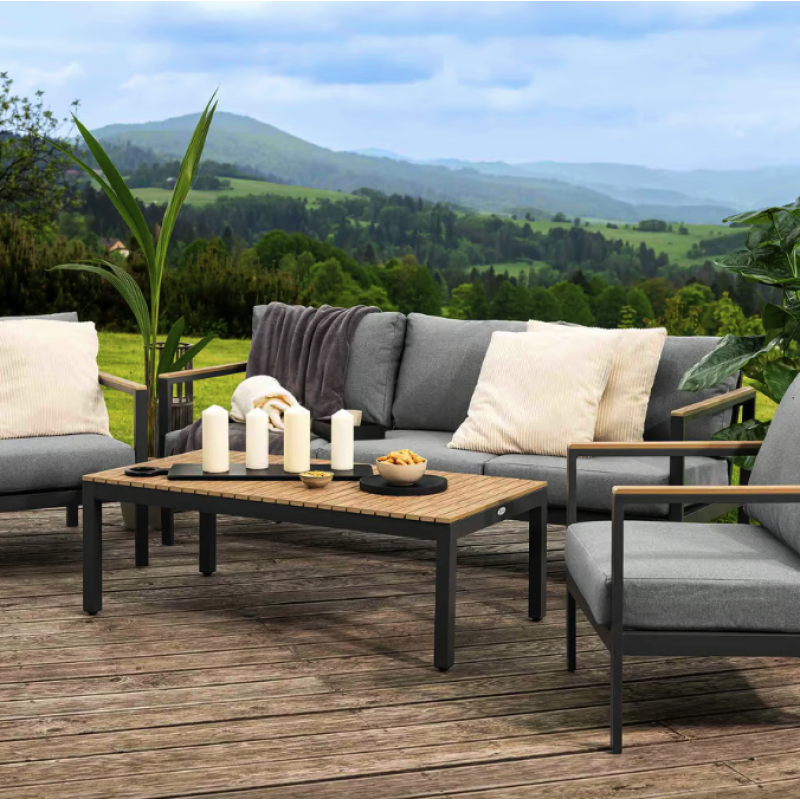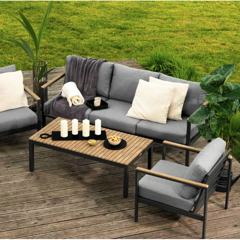 Садовая мебель Tivoli была создана с учетом комфорта использования, функциональности и элегантности. Набор, включающий трехместный диван, два кресла и журнальный столик, идеально подойдет для обустройства вашего сада или террасы, создаст место для отдыха и времяпрепровождения с близкими. Конструкция мебели совмещает легкий алюминиевый каркас с элементами из современного поливуд материала, имитирующего дерево. Такие материалы гарантируют долговечность, устойчивость к погодным условиям и стильный внешний вид мебели. Комплект дополнен мягкими графитовыми подушками. Благодаря универсальному и вневременному дизайну мебель Tivoli прекрасно смотрится как в традиционно, так и в современно оформленных помещениях.