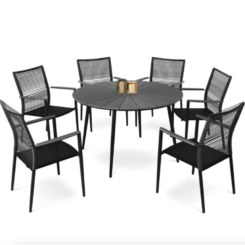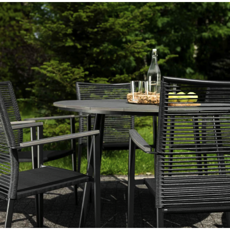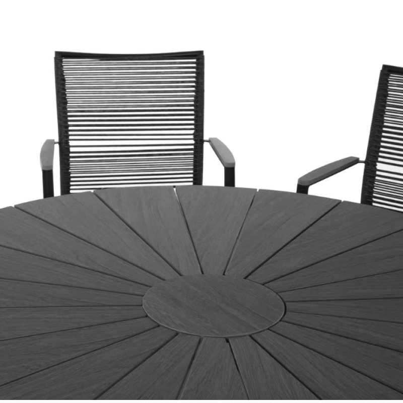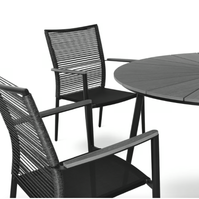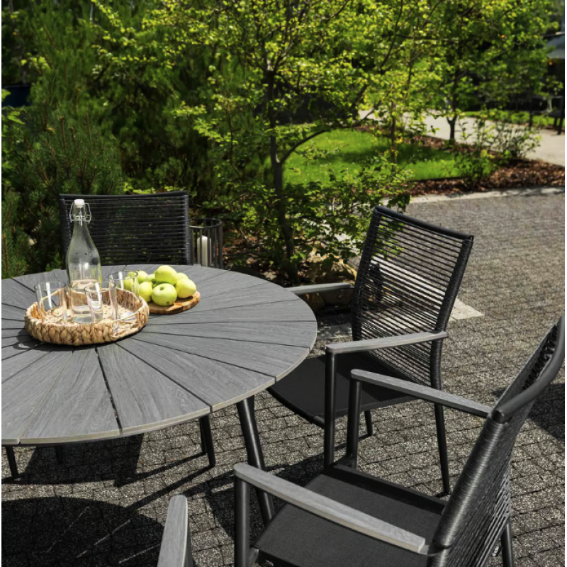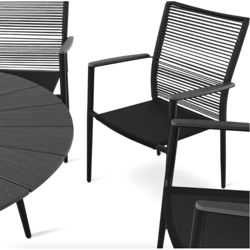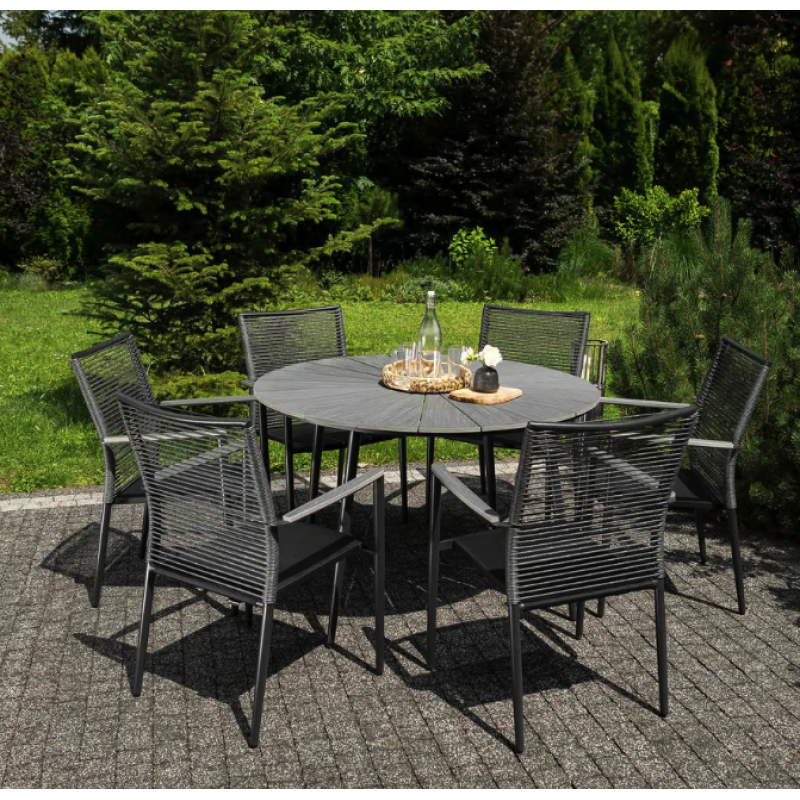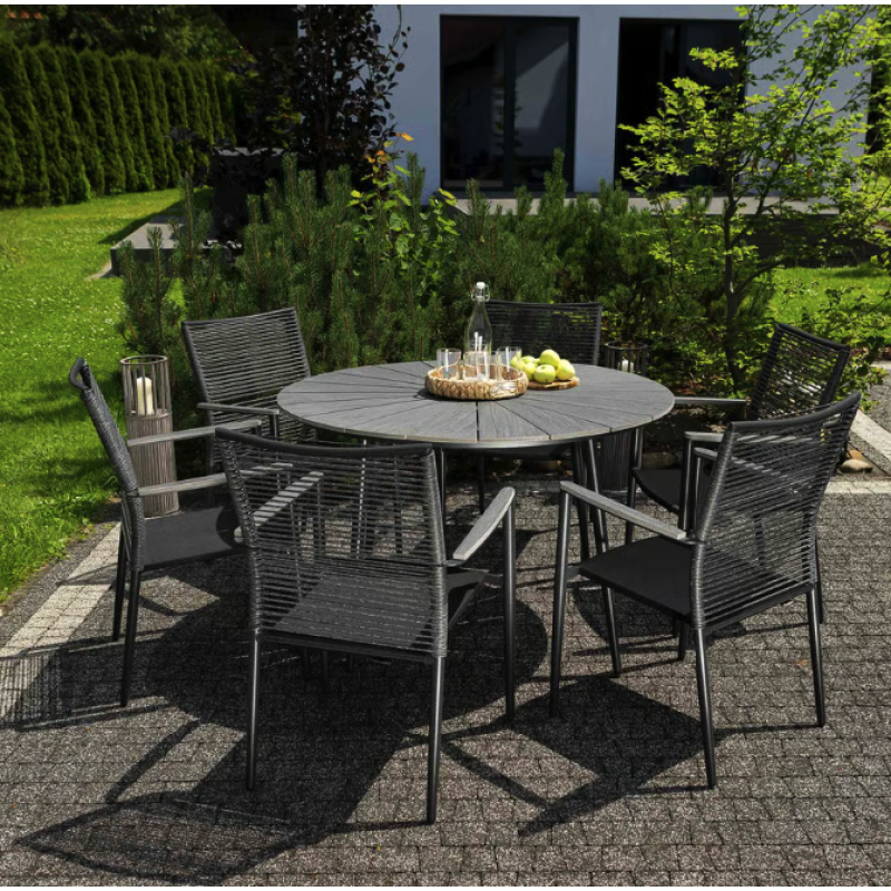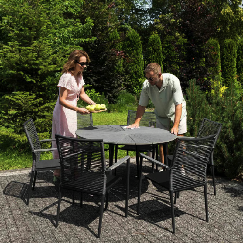 Arona - практичный и элегантный набор садовой и террасной мебели. Круглый стол и шесть удобных кресел с подлокотниками идеально подходят как для повседневного времяпрепровождения на свежем воздухе, так и для барбекю и семейных ужинов. Садовая мебель Arona отличается современным дизайном и высококачественными материалами, благодаря которым стол и стулья приобретают эстетический вид и устойчивость к влаге и изменяющимся погодным условиям, в том числе: дождь, УФ-лучи или высокие или низкие температуры. Минималистичный стиль мебели, основанный на простоте форм и цветов, ограниченных классическим черным и модными оттенками серого, позволяет удачно вписаться в любое оформление пространства, как классическое, так и современное.