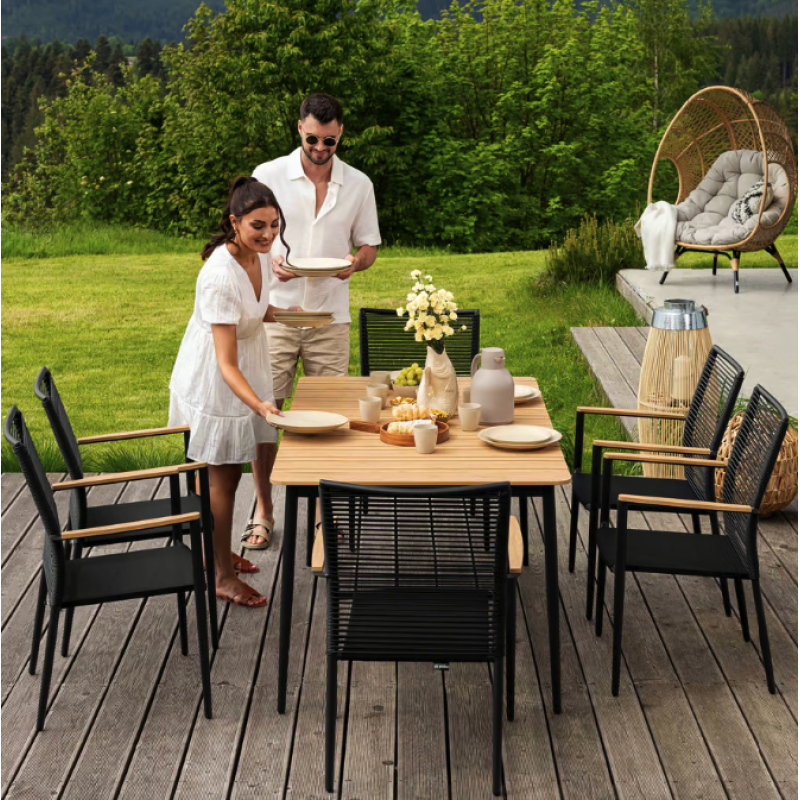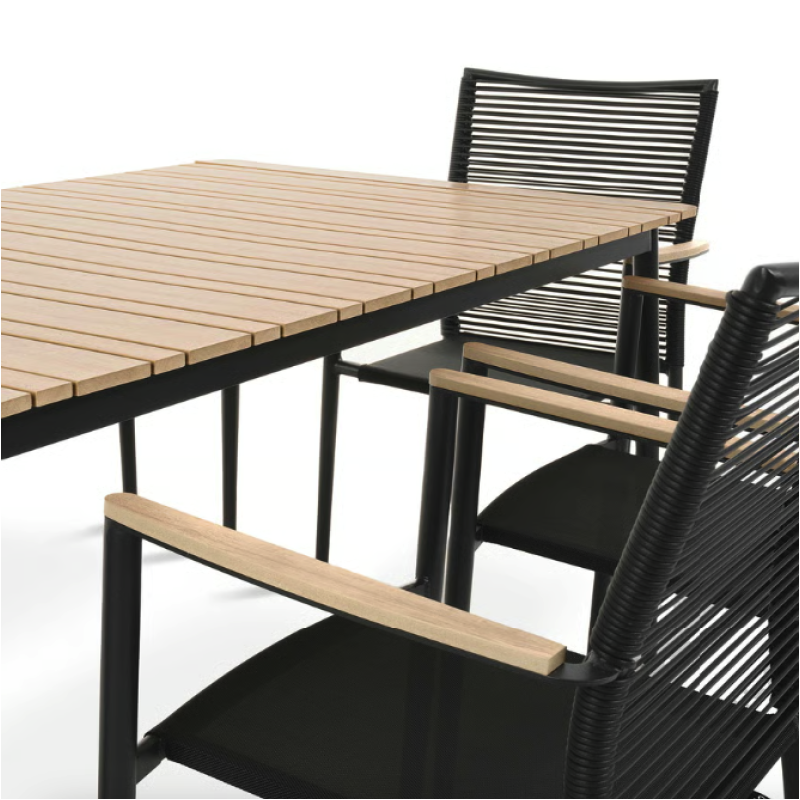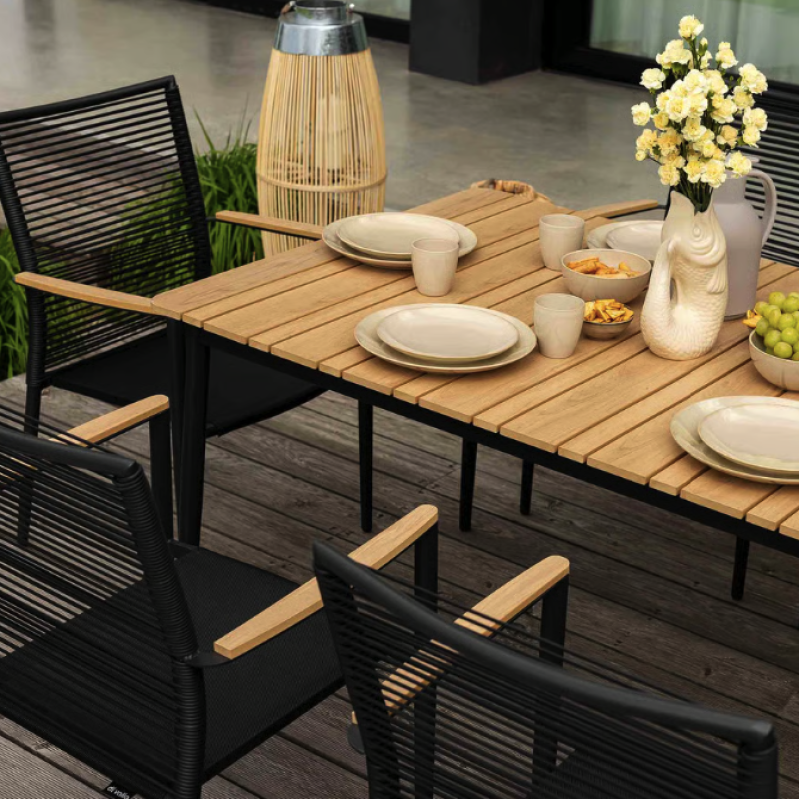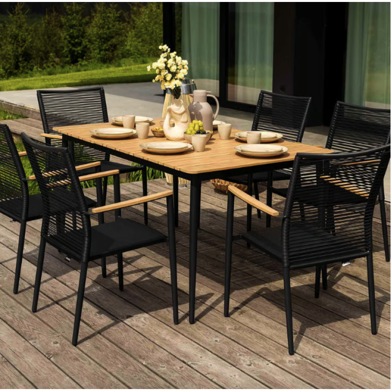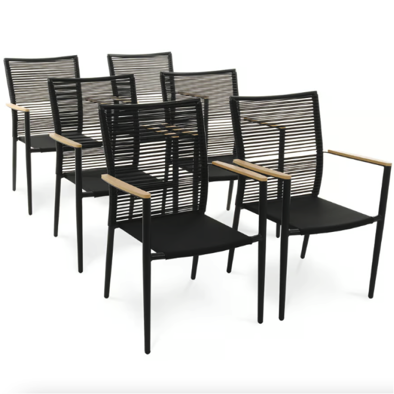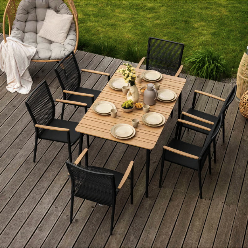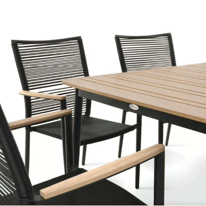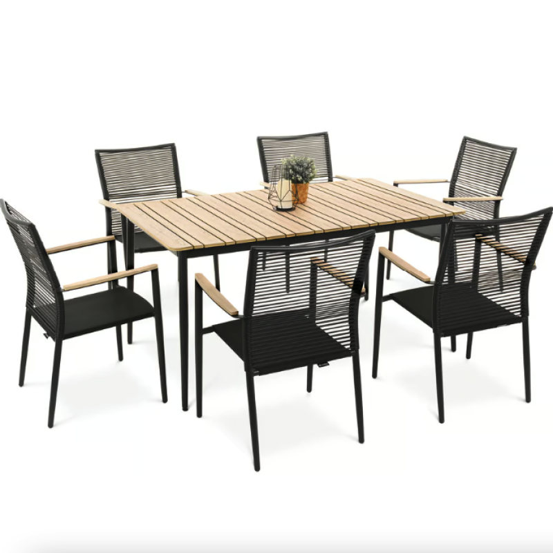 Набор садовой мебели Breno от Di Volio сделает ваше открытое пространство идеальным местом для отдыха, встречи с друзьями и совместного празднования еды. Комплект состоит из большого стола с прямоугольной столешницей и шести удобных стульев с подлокотниками. Благодаря использованию прочных материалов мебель полностью устойчива к вредному воздействию различных погодных условий. Сочетание алюминиевой рамы, техноротанга и ткани Textilene насыщенного черного цвета с контрастными элементами натурального бежевого оттенка придает мебели универсальный современный вид, который идеально вписывается как в минималистичный, так и в классический дизайн сада и террасы.