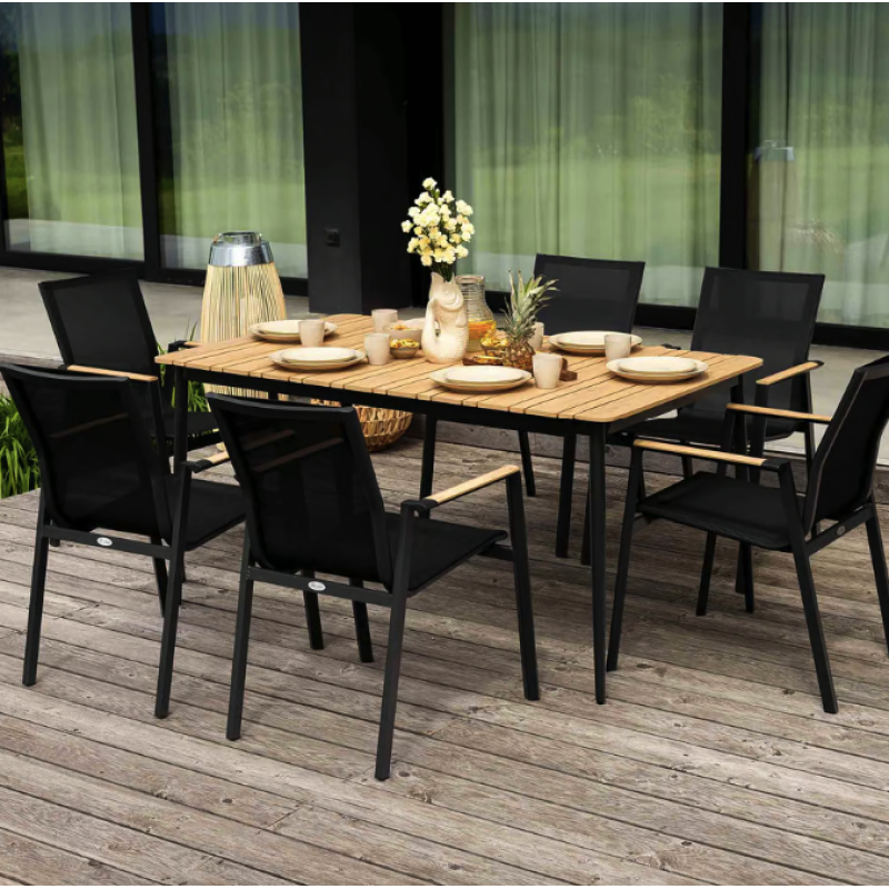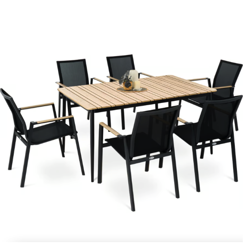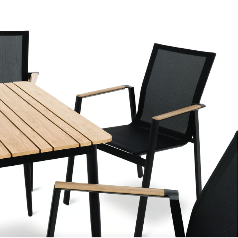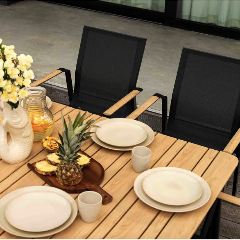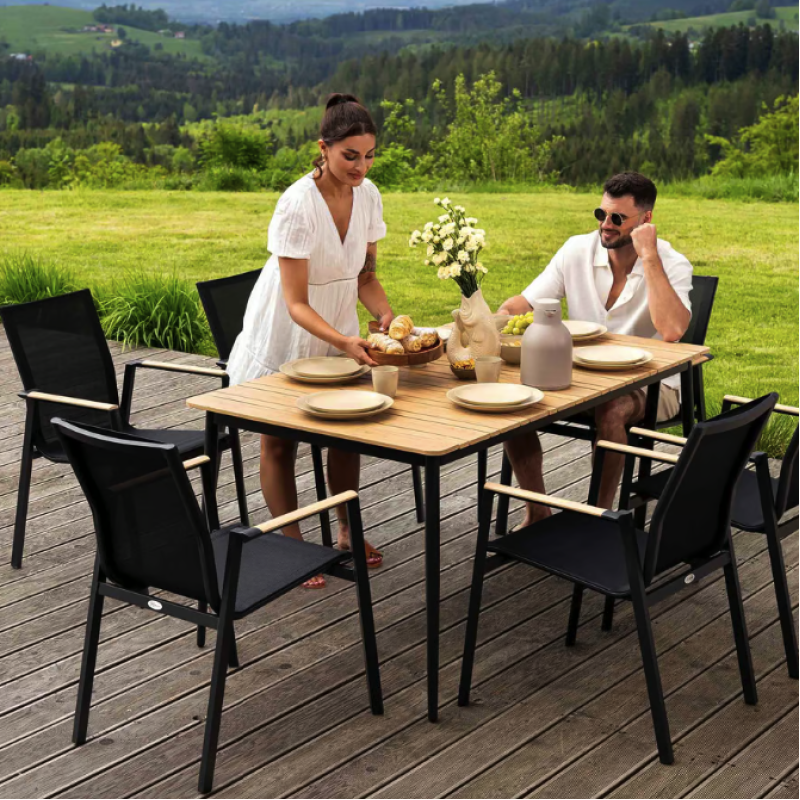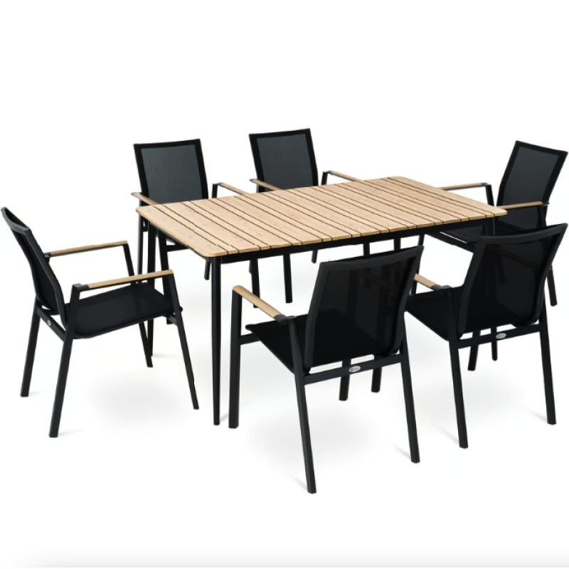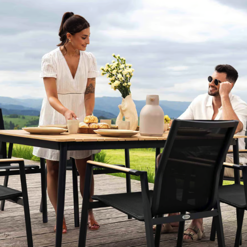 Мечтаете наслаждаться теплыми летними вечерами или уютными осенним утром с чашечкой кофе на террасе или балконе? Комплект садовой мебели Brivio от Di Volio является идеальным предложением для всех, кто хочет, чтобы их сад или терраса стали комфортным местом не только для отдыха, но и для встреч с семьей и друзьями и общей трапезы на свежем воздухе. В большой набор входят шесть удобных кресел с подлокотниками и большой стол с вместительной столешницей, на которой хватит места всем гостям. Мебель Brivio отличается современным дизайном и высококачественными материалами. Сочетание алюминиевой конструкции с черным порошковым покрытием, материала имитирующего натуральное дерево поливуд и прочной ткани Textilene обеспечивает не только эстетичный вид мебели, но и исключительную устойчивость к изменяющимся погодным условиям. Благодаря этому садовая мебель сохранит свой неизменный вид в течение многих сезонов.