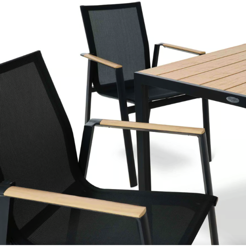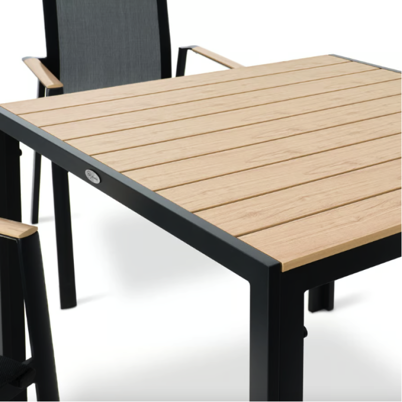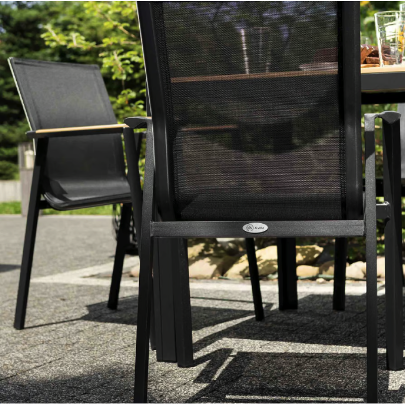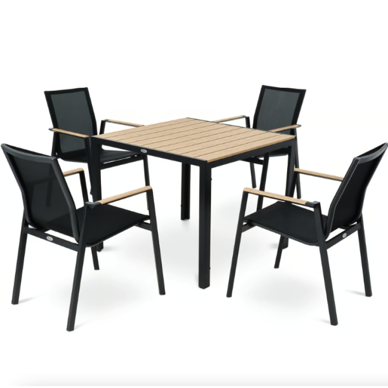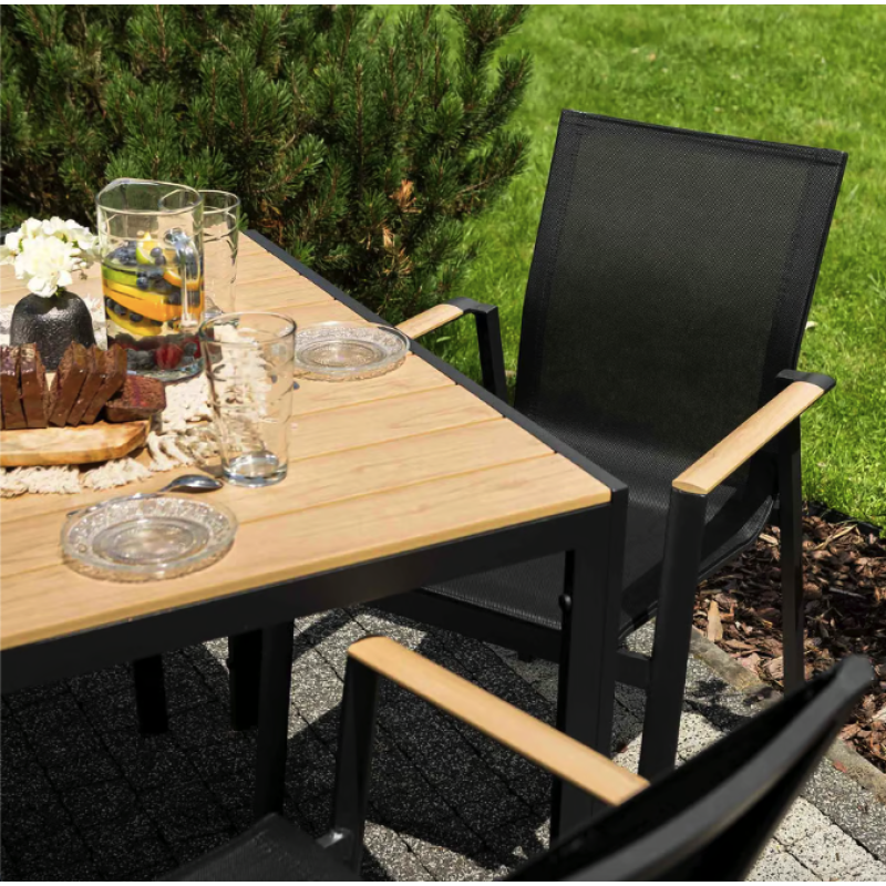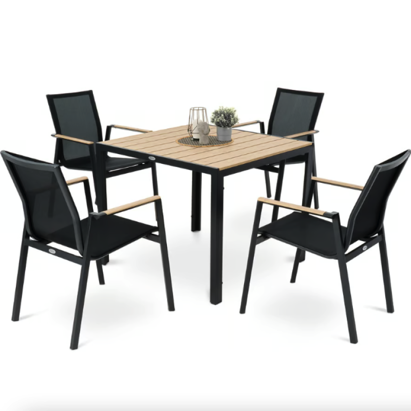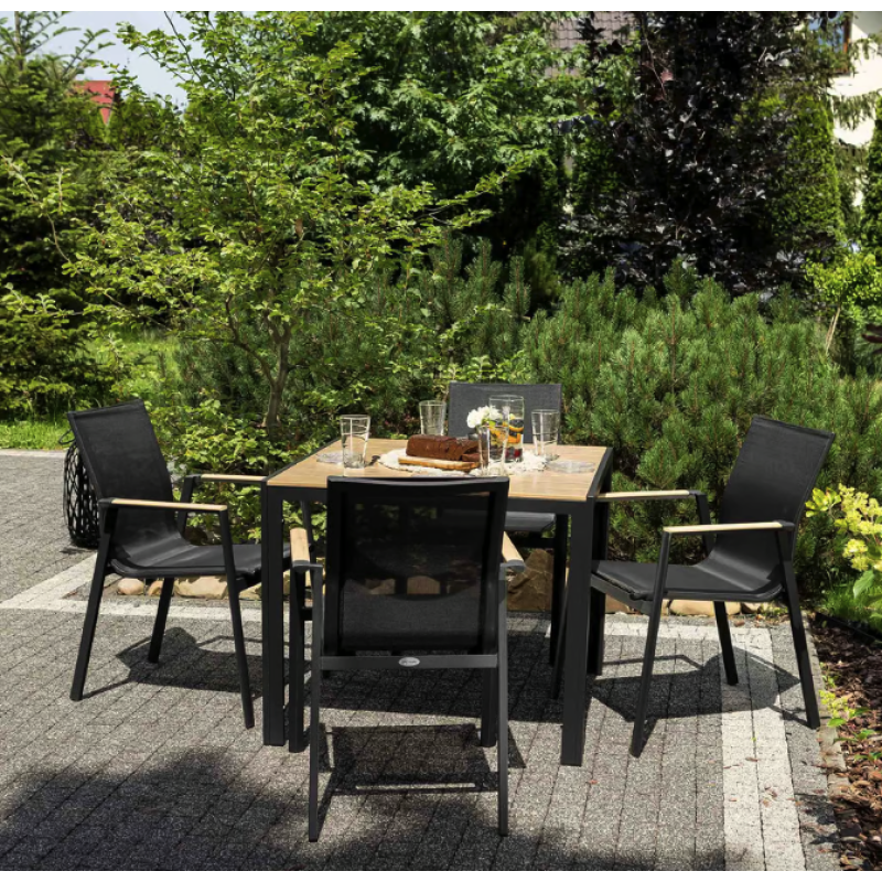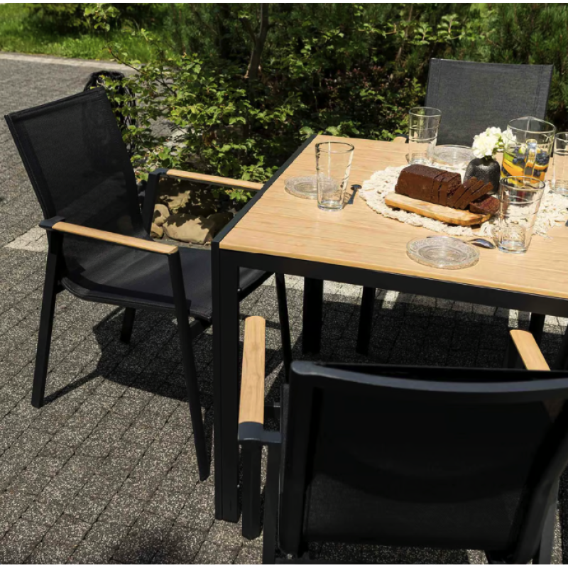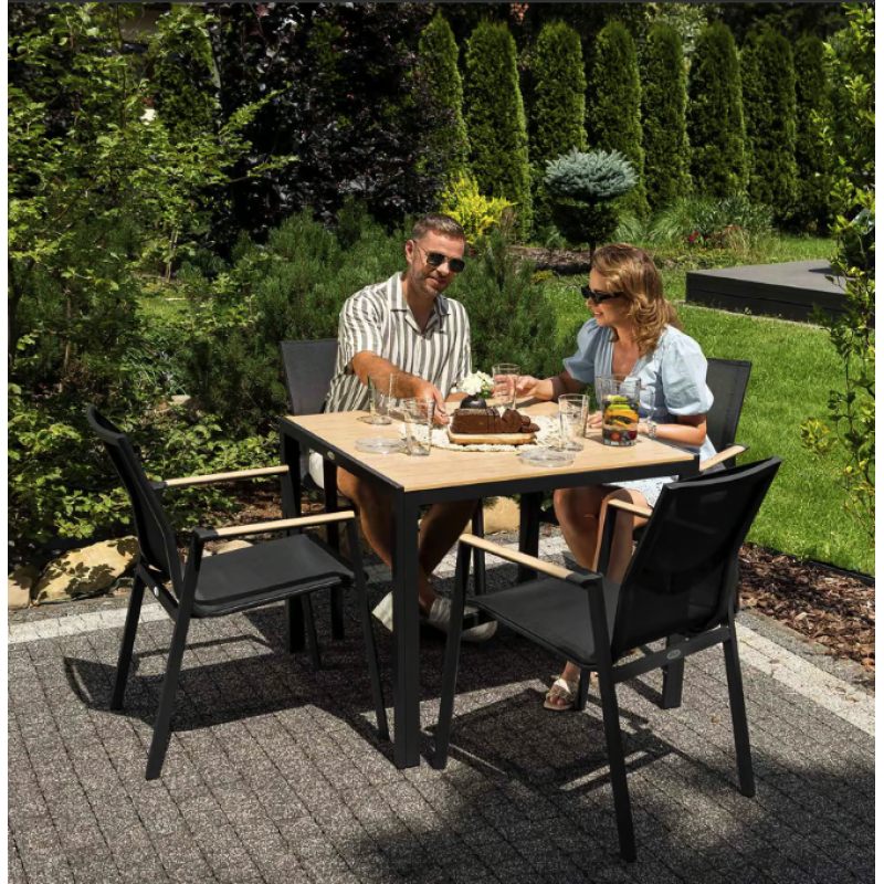 Четырехместный комплект садовой мебели Cremo от Di Volio позволит вам создать комфортное и стильное пространство для отдыха и обеда на свежем воздухе. Набор состоит из квадратного стола с деревянной столешницей и четырех стульев с практичными подлокотниками. Мебель характеризуется аккуратными размерами, что делает набор Cremo отличным выбором как для больших, так и для меньших садов или террас. Благодаря использованию прочных материалов мебель не портится, не трескается и не теряет цвет на протяжении многих лет использования, даже подвергаясь разным погодным условиям. Современный дизайн мебели, сочетающий простые формы и цвета, ограниченные матовым черным и натуральным бежевым, придает мебели элегантный вид и универсальный характер, благодаря чему она может стать отличным основанием для любого обустройства внешнего пространства дома, независимо от его стиля.