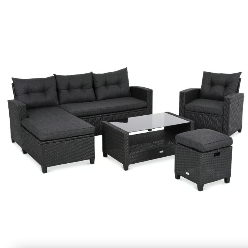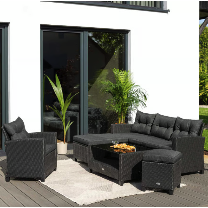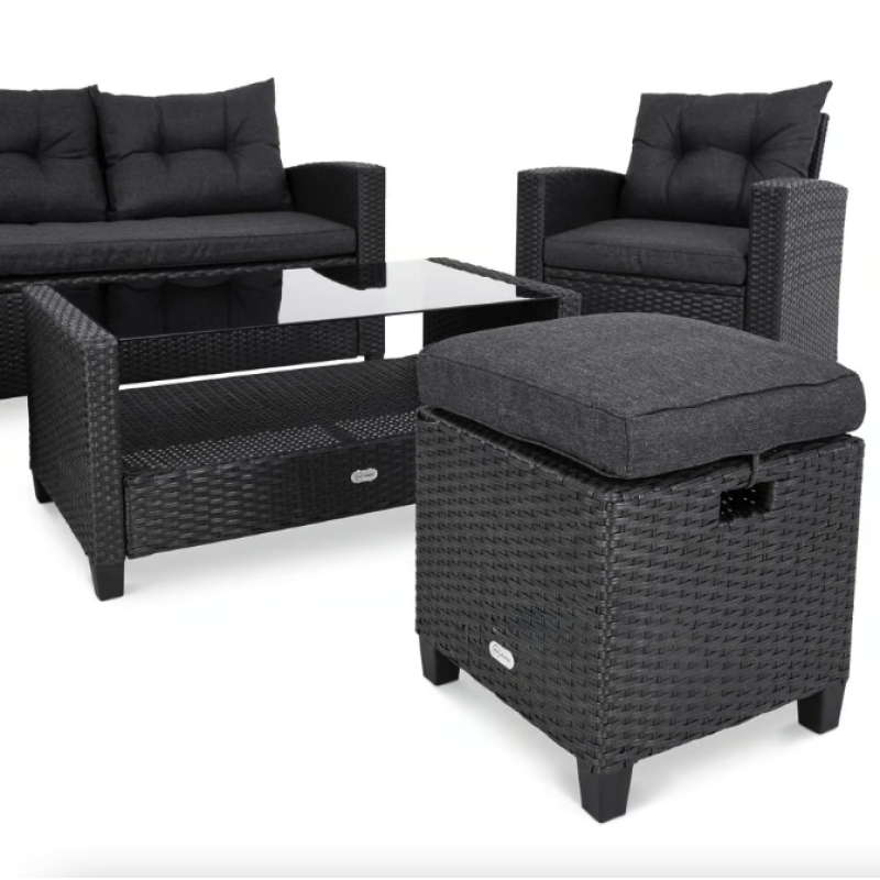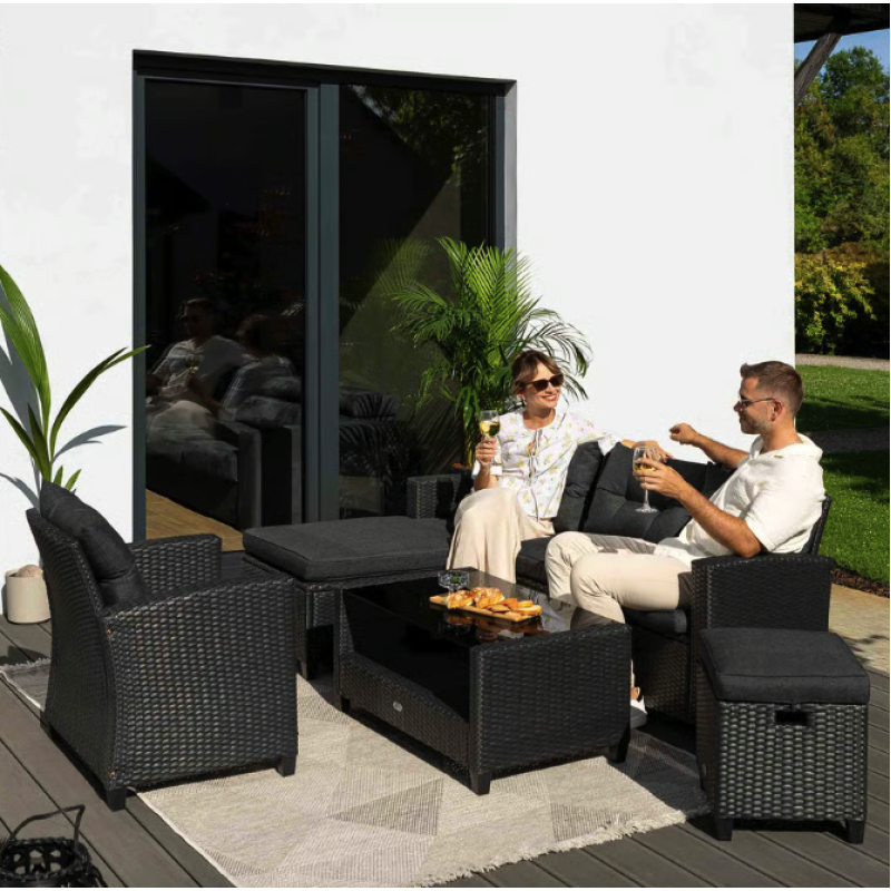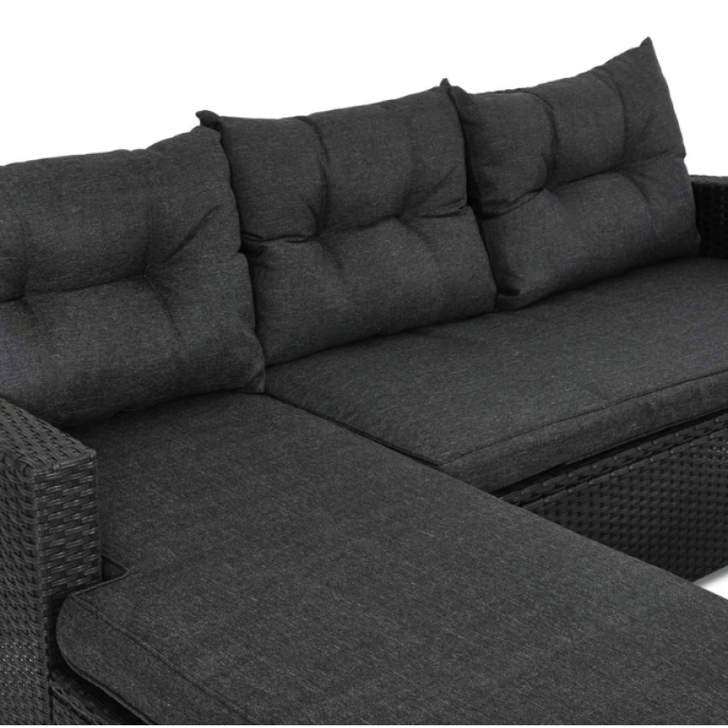 Садовая мебель Dalmia представляет собой идеальное предложение для людей, которые ценят комфорт, стиль и функциональность в обустройстве открытых пространств. Комплект состоит из четырехместного углового дивана, кресла с подлокотниками, табурета, который также можно использовать в качестве дополнительного сиденья, журнального столика. Угловой диван можно установить двумя способами - как левосторонним, так и правосторонним, что позволяет идеально подобрать мебель к любому простору сада или террасы. Комплект изготовлен из высококачественного техноротанга натурального бежевого оттенка, очень прочен и устойчив к погодным условиям. Сидения и спинки углового дивана и кресла оснащены мягкими подушками, обеспечивающими комфорт во время сидения. Дизайн мебели, основанный на простоте форм и модных, сдержанных тонах, придает гарнитуру Dalmia элегантный и современный вид. Конструкция мебели Dalmia сочетает в себе крепкий стальной каркас и плетеное полотно из техноротанга. В комплект также входит флисовый плед, который пригодится в прохладные вечера, обеспечивая дополнительный комфорт и уют.