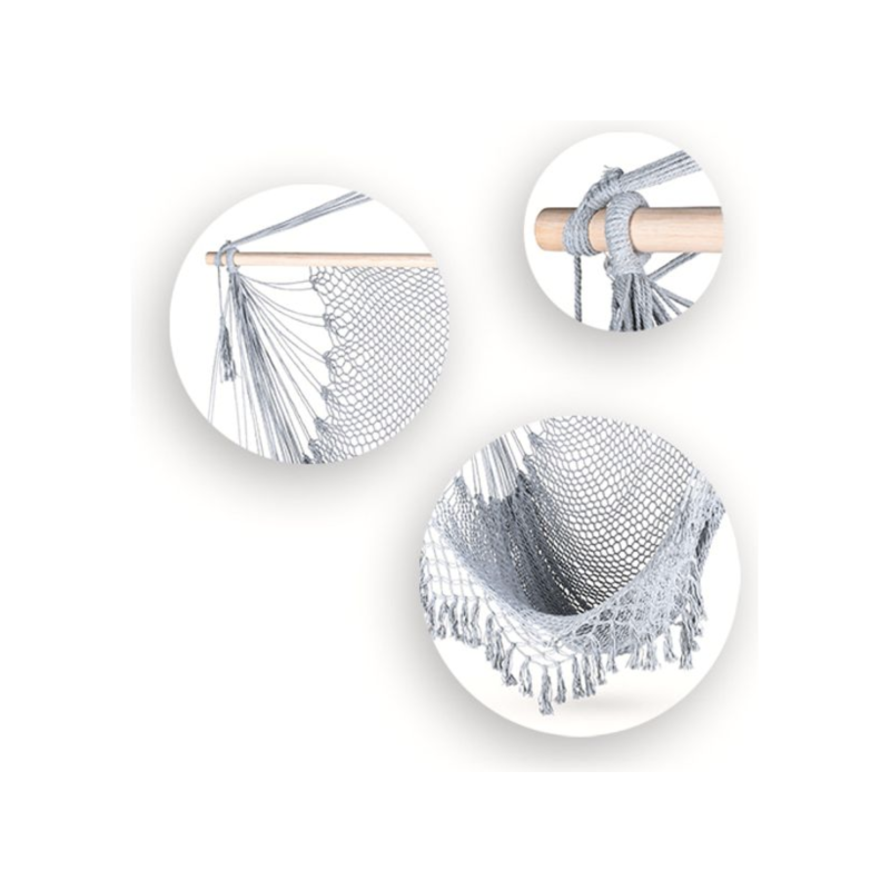 Гамак изготовлен из качественного прочного материала, характеризующегося высокими эксплуатационными свойствами, стойкостью к истиранию и механическим повреждениям и, что немаловажно, приятен на ощупь. Подвесное бразильское кресло от Outtec чрезвычайно удобно, его размеры позволят вам длительное время проводить в кресле, читая книгу или смакуя любимым напитком.