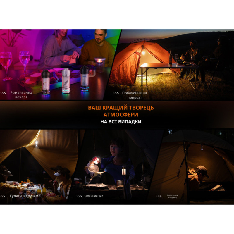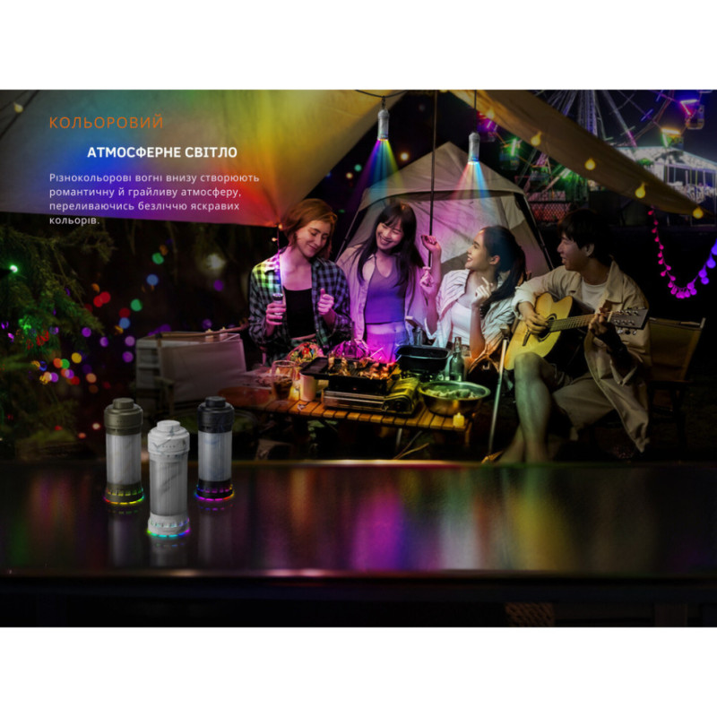 Модель укомплектована світлодіодами COB, холодним білим діодом Redslight SC1818C та 12 діодами WS2812B-3535 — кожен з терміном служби не менше 50 тисяч годин. Різноманітність варіантів променя дозволяє адаптувати світло під індивідуальні потреби: ліхтар можна активувати в стандартному режимі освітлення на 360° (колірна температура 3000К) або зі спрямованим донизу променем (6500К), комбінувати ці режими для досягнення максимальної освітленості або вмикати кольорове підсвічування, створюючи затишну атмосферу вдома чи на природі.