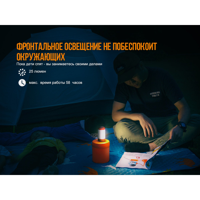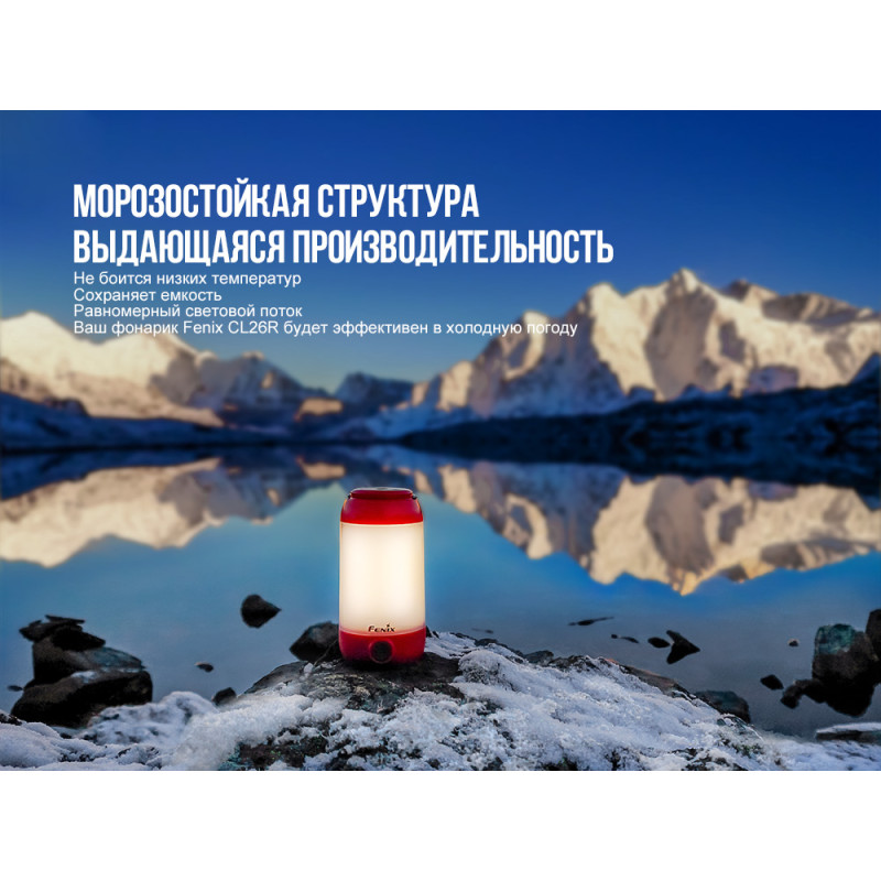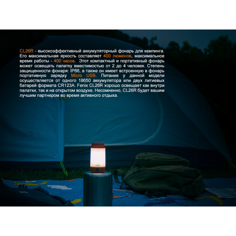 Модель Fenix CL26R розроблена для всіх туристів, любителів пікніків і риболовлі. Це кемпінговий ліхтар, який дає розсіяне світло і якісно висвітлює простір в будь-якому напрямку. Він відмінно пристосований до експлуатації в польових умовах, зроблений міцним, захищеним від дощу, дуже простим у використанні.
