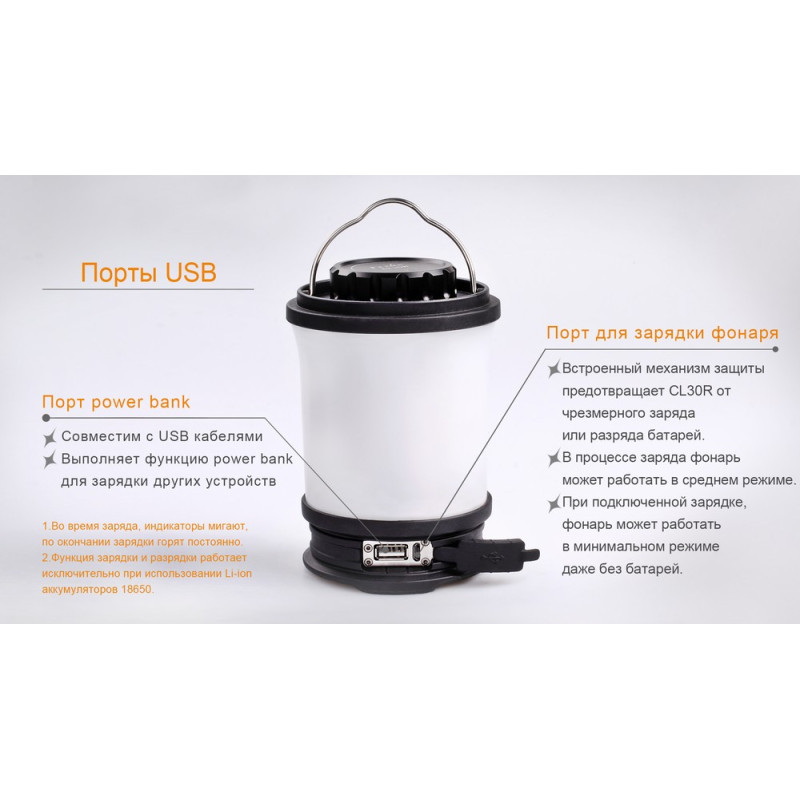 Важливою особливістю моделі CL30R є те, що акумулятори можна заряджати не тільки в стандартному зарядному пристрої, але і використовуючи роз'єм micro-USB. У цьому випадку буде потрібно додатковий адаптер напруги. Також від ліхтаря можна зарядити мобільний телефон або інші пристрої, використовуючи CL30R як power-банк.
