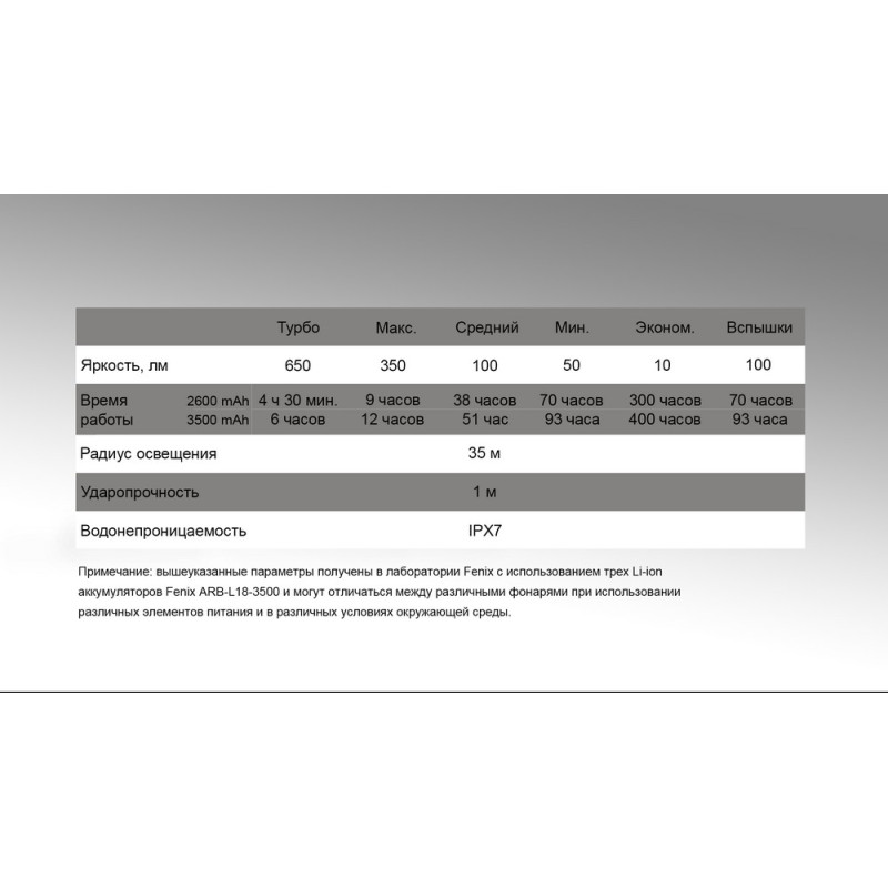 | Яскравість | | 650 люмен | 350 люмен | 100 люмен | 50 люмен | 10 люмен | 100 люмен |