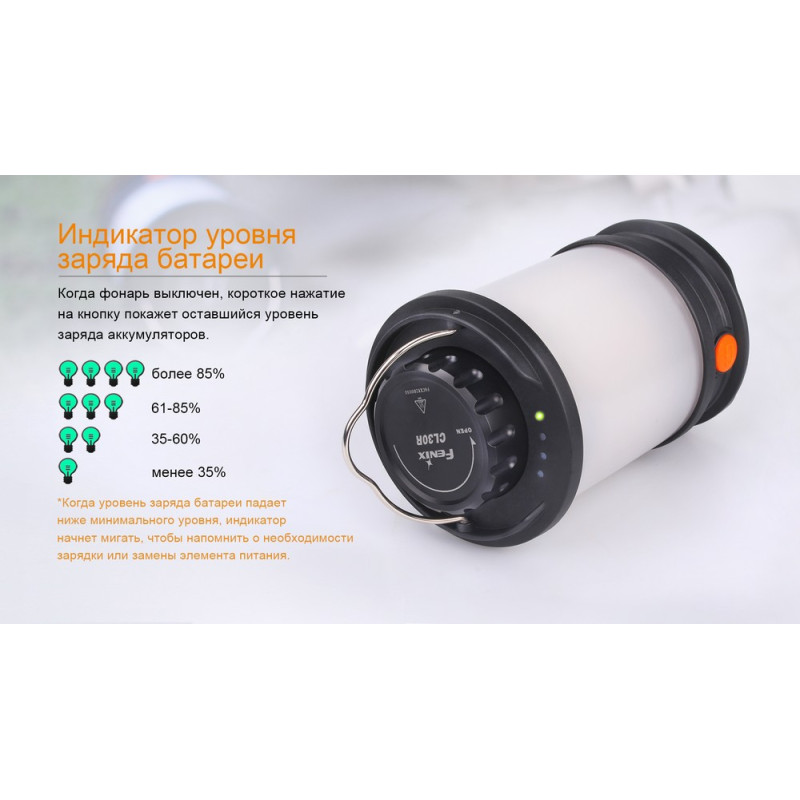Час роботи ліхтаря в кожному з доступних для вибору режимів, безпосередньо залежить від ємності використовуваних елементів живлення. Повний комплект складають три акумулятори розміром 18650. Однак потрібно зазначити, що Fenix CL30R може працювати і на одному або двох елементах живлення, якщо немає можливості встановити відразу цілий комплект. За умови використання фірмових батарей на 2600 маг, час роботи в різних режимах складе від 4 з половиною, до 300 годин. Ці показники можна збільшити, якщо використовувати більш ємкі акумулятори на 3500 мАч. Тоді час автономної роботи кемпінгового ліхтаря складе від 6 до 400 годин. Контролювати рівень заряду користувач може в будь-який час за допомогою вбудованого індикатора. Щоб його активувати достатньо один раз натиснути на кнопку виключеного ліхтаря. Якщо будуть світитися всі 4 лампочки індикатора, значить заряду — більше 85%. Тільки три світяться лампочки говорять про рівень заряду в межах 61-85%. Якщо залишилося 36-60% заряду, то включаться всього дві лампочки. Ну а єдина працююча лампочка означає, що заряду менше 35%.