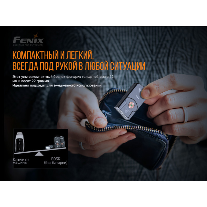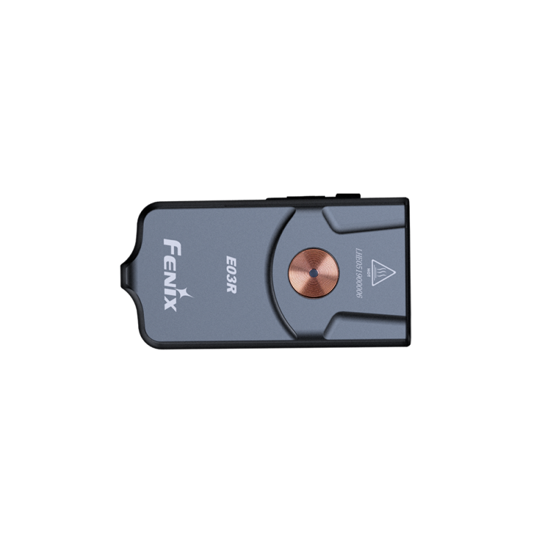 Модель Fenix E03R являє собою маленький брелок для ключів, з повністю металевим корпусом. При виготовленні вироби використовували високоточну машинну обробку. Ліхтар має вбудований літій-полімерним акумулятором на 200 міліампер-годин. Є функція індикації ступеня зарядженості, а також опція попередження про низьку напругу. Виріб забезпечено поглибленої кнопкою з можливістю блокування.