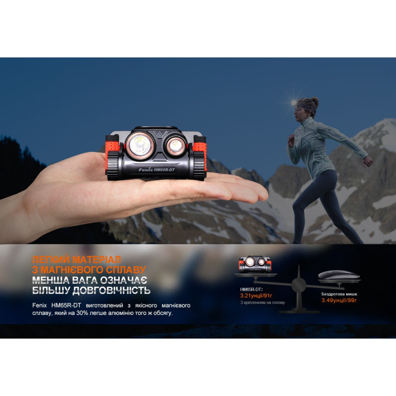 Функціональні особливості та конструкція Fenix HM65R-DT розроблені з урахуванням потреб спортсменів, які не звикли відмовлятися від тренувань у темний час доби. Ліхтар із налобним кріпленням також підходить для туризму та активного відпочинку, оскільки освітлює дистанцію до 170 метрів і при цьому звільняє обидві руки для інших дій.