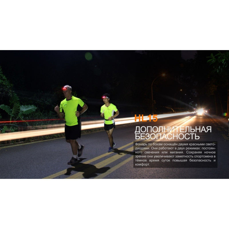 Ремінець на голову для моделі Fenix HL15 зроблений еластичним, з можливістю регулювати розмір. Крім того, на ньому є особливі вставки, що відбивають світло, а щільна посадка цього ремінця допомагає захистити очі від попадання в них поту під час бігом або інших занять, що вимагають інтенсивного навантаження.