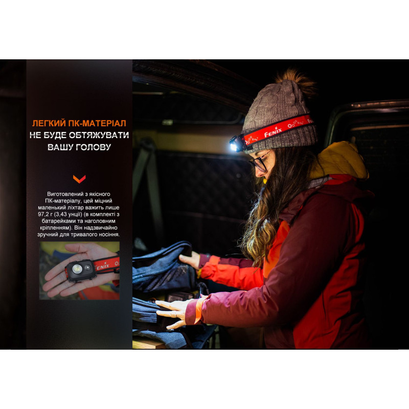 Вага Fenix HL16 разом із оголов’ям та повним комплектом батарей становить всього 97.2 грамми.