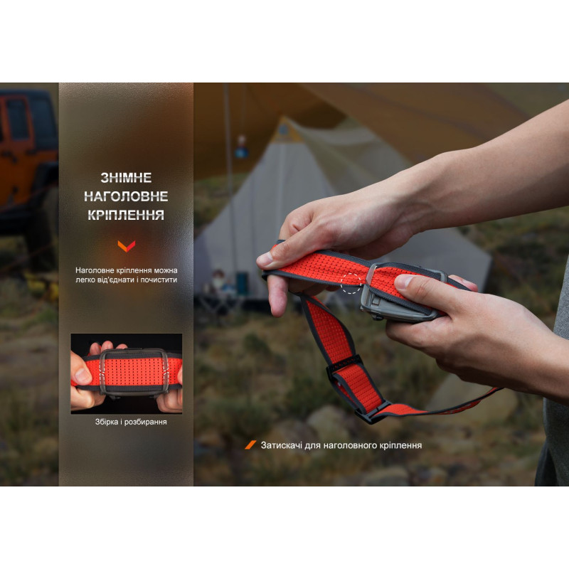 Ліхтар укомплектований фірмовим налобним кріпленням шириною 36 міліметрів. Перфороване оголов'я має оптимальну повітропроникність, щоб запобігти появі неприємного відчуття попрілості шкіри. Довжину резинки можна змінити за допомогою регулятора. По всій довжині кріплення розташовані світловідбивні елементи, які роблять користувача видимим у темний час доби, наприклад, коли він переходить автомобільну дорогу.