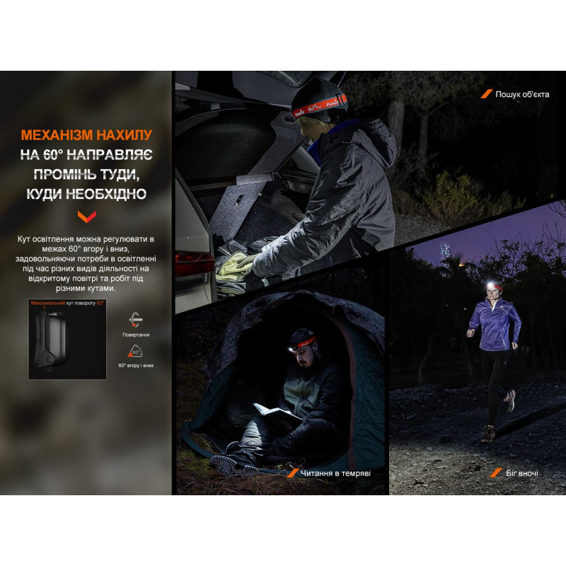 Експлуатаційний термін обох діодів складає понад 50 тисяч годин. Ще один приємний бонус ліхтаря — можливість нахилу корпусу на 60°. Це дозволяє користувачу виставити комфортний кут освітлення, адаптувавши світло під власні потреби.