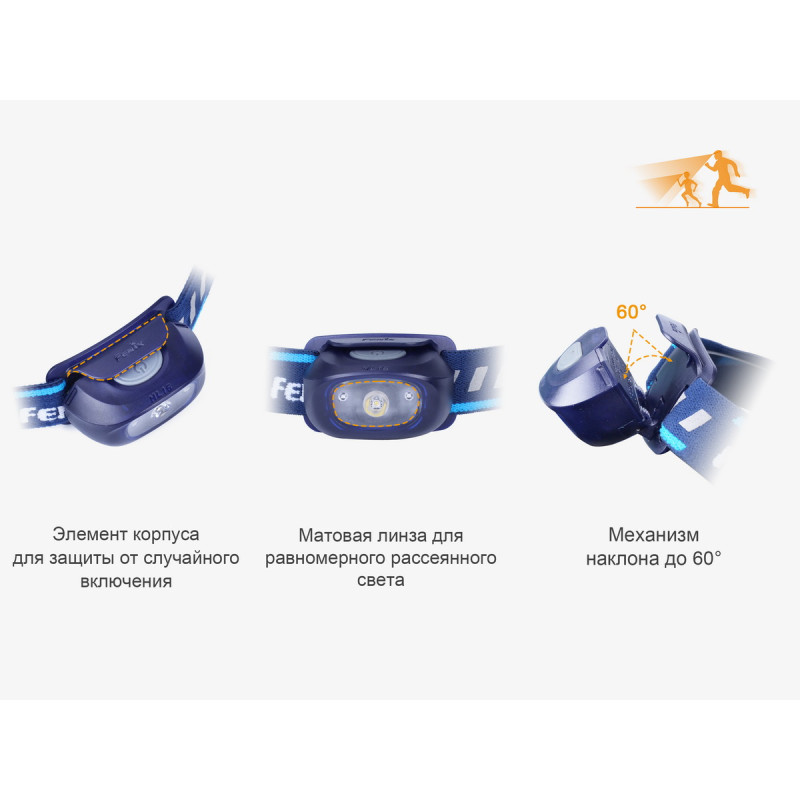 Включати, вимикати і перемикати режими в ліхтарі можна всього однією кнопкою, що забезпечує додаткову зручність. Крім того, управління інтуїтивне, бо дитина впорається з ним без проблем. На пов'язці присутні світловідбиваючі смуги. Ліхтар можна нахилити вперед на кут 60 градусів.