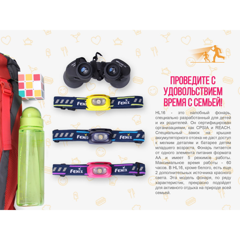 Туристичний налобний ліхтар HL16 відмінно підійде дітям і підліткам. Інженери компанії Fenix продумали все до дрібниць: батарейний відсік закривається спеціальним ключем, корпус зроблений з ABS-пластика і анодованого алюмінію, є повна пыленепронецаемость. Слід зазначити, що ліхтар ще і вологозахищений, а тому в ньому можна ходити навіть під дощем.