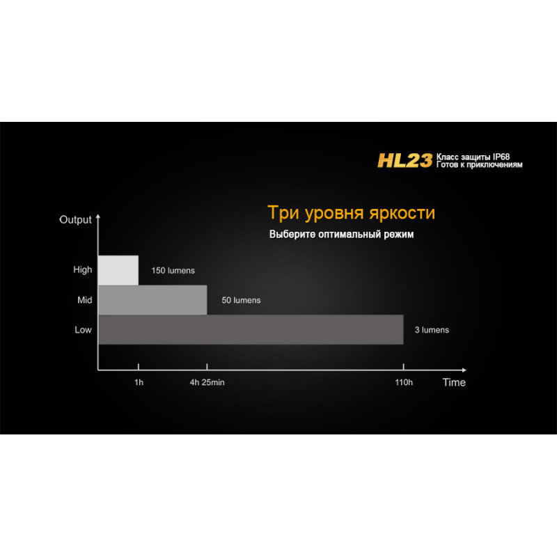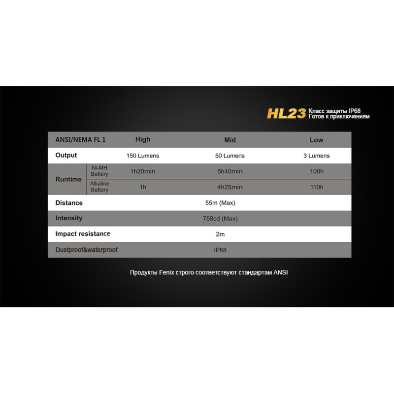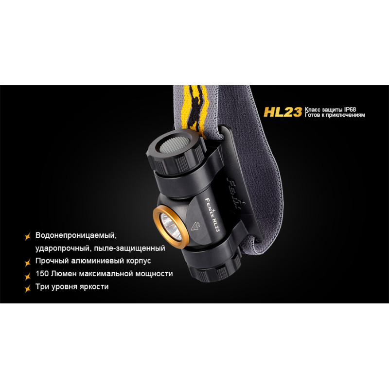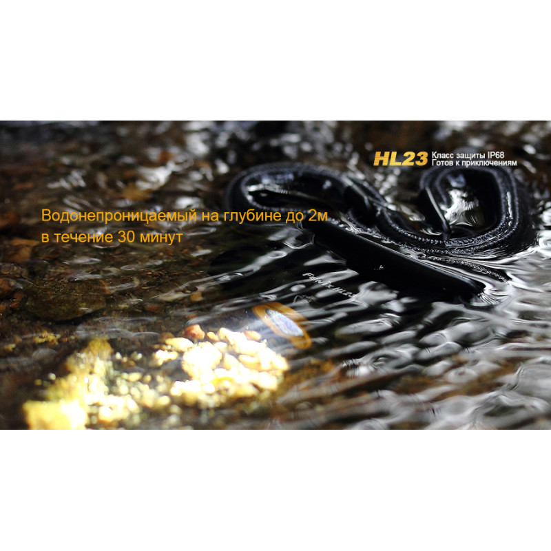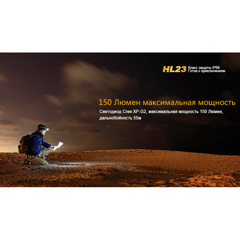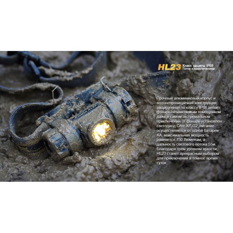 Базою оптичної системи HL23 є світлодіод Cree XP-G2 R5. Він не тільки дозволяє ліхтаря відтворювати світловий потік до 150 люмен, але і володіє ресурсом роботи-50 000 ч. Крім максимального режиму яскравості (High), Fenix HL23 працює в 2 режимах: Mid — 50 люмен, Low — 3 люмена.