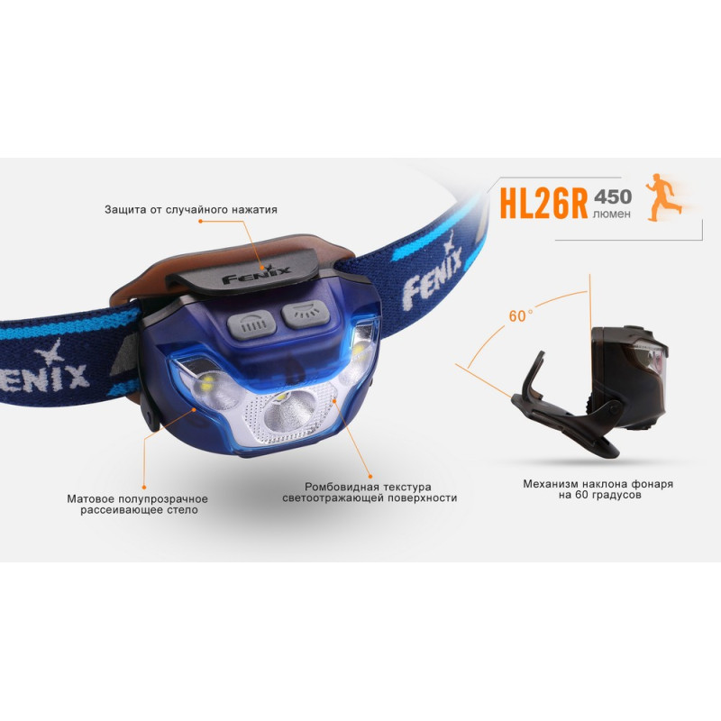 Fenix HL26R дуже зручний для бігу або інших занять спортом. Це налобний ліхтар з невеликим за розміром і вагою корпусом і практичним набором робочих режимів. Він оснащений відразу трьома світлодіодами, які забезпечують різний за характеристиками освітлення. Поцентру встановлений діод Cree білого кольору XP-G2 R5. Він працює в чотирьох режимах: