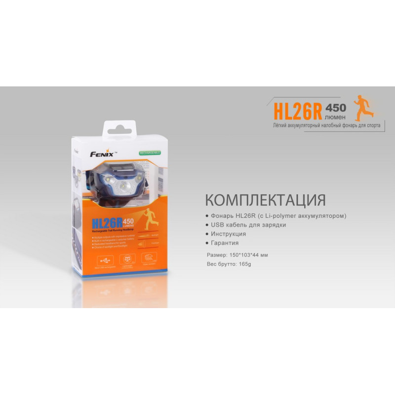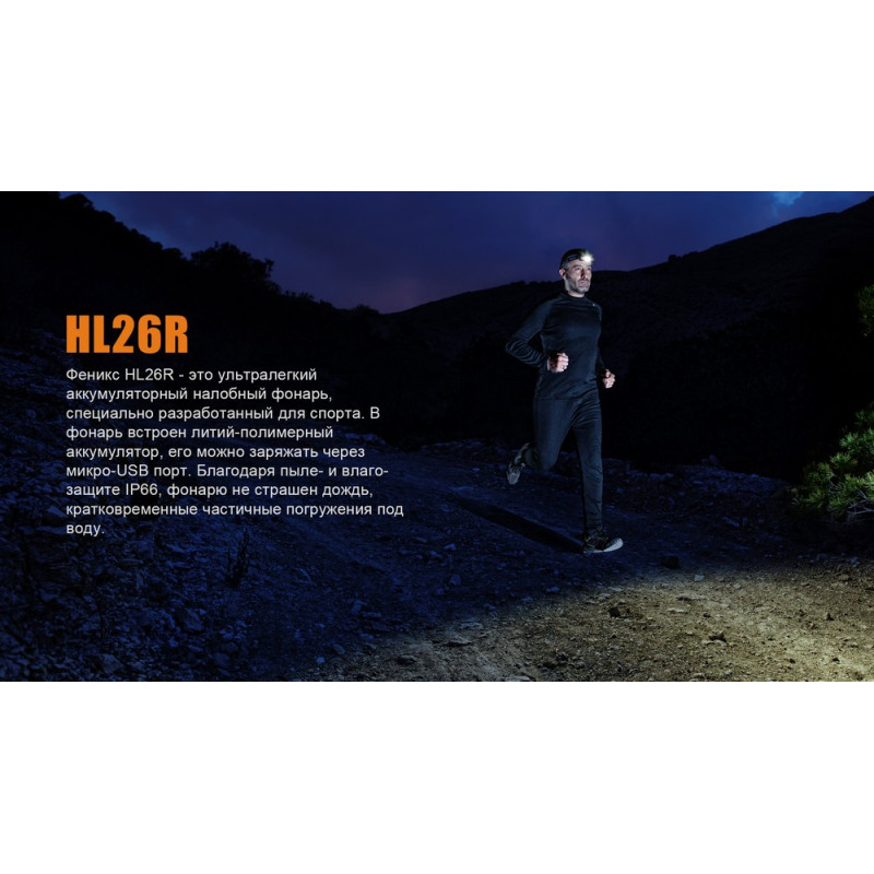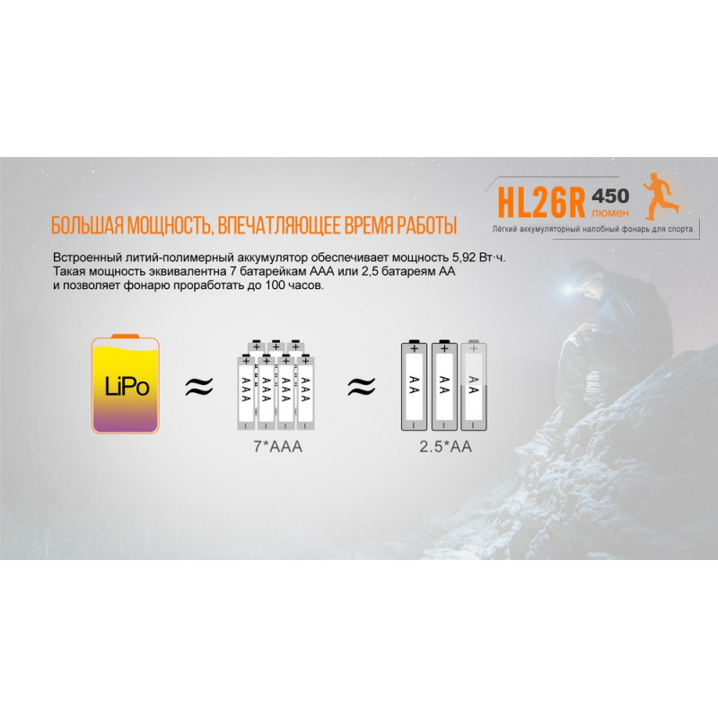 У моделі Fenix HL26R встановлений літій-полімерний акумулятор. Він відрізняється дуже низькою саморазрядкой і в стані витримувати без помітного просідання ємності близько 500 циклів роботи. Цей акумулятор має ємність 1600 маг і заряджається, наприклад, від зовнішнього банку або іншого джерела живлення, який можна підключити через USB.
