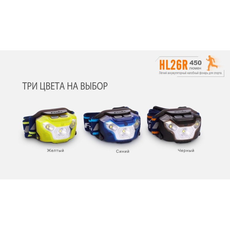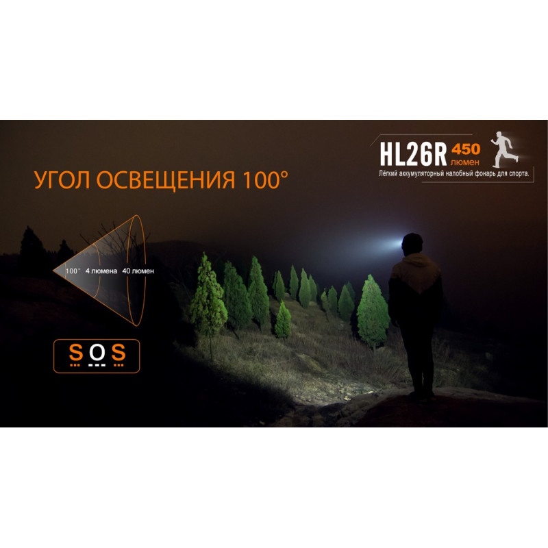 Fenix HL26R дуже зручний для бігу або інших занять спортом. Це налобний ліхтар з невеликим за розміром і вагою корпусом і практичним набором робочих режимів. Він оснащений відразу трьома світлодіодами, які забезпечують різний за характеристиками освітлення. Поцентру встановлений діод Cree білого кольору XP-G2 R5. Він працює в чотирьох режимах: