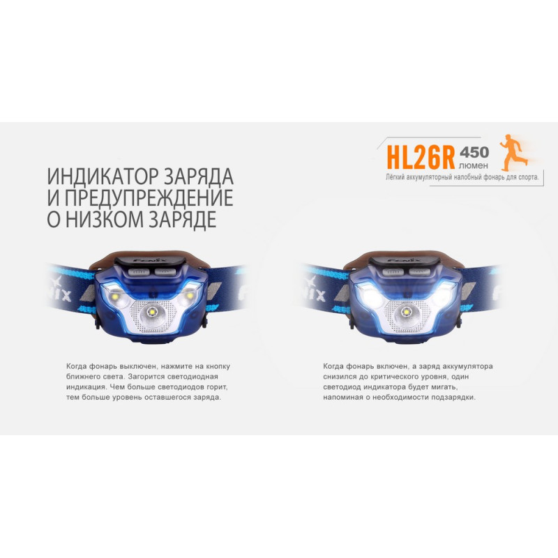 У моделі Fenix HL26R встановлений літій-полімерний акумулятор. Він відрізняється дуже низькою саморазрядкой і в стані витримувати без помітного просідання ємності близько 500 циклів роботи. Цей акумулятор має ємність 1600 маг і заряджається, наприклад, від зовнішнього банку або іншого джерела живлення, який можна підключити через USB.