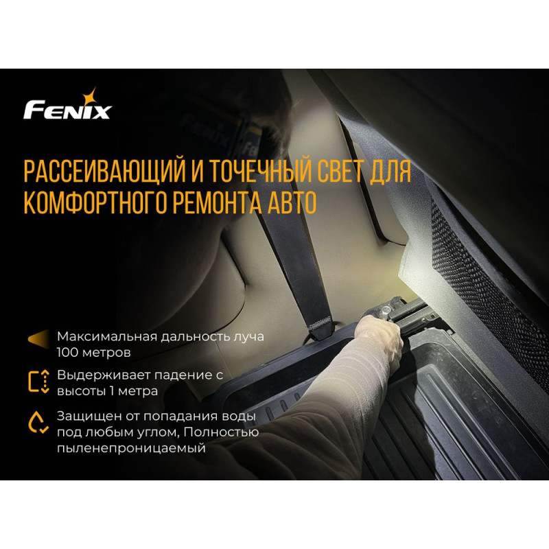 - Burst — режим максимальної яскравості (450 люмен), з дальністю променя 100 метрів. На одному заряді ліхтар працює півтори години;