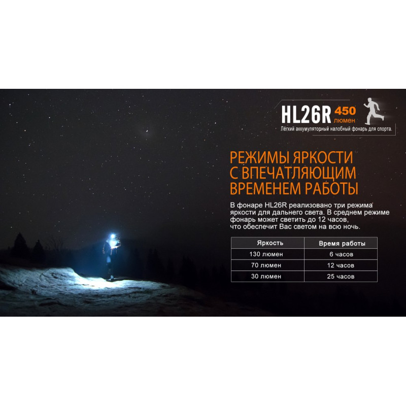 Fenix HL26R дуже зручний для бігу або інших занять спортом. Це налобний ліхтар з невеликим за розміром і вагою корпусом і практичним набором робочих режимів. Він оснащений відразу трьома світлодіодами, які забезпечують різний за характеристиками освітлення. Поцентру встановлений діод Cree білого кольору XP-G2 R5. Він працює в чотирьох режимах: