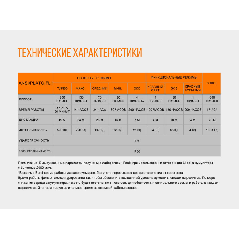 - Turbo: промінь світла з яскравістю 300 люмен і можливістю висвітлювати простір у радіусі 49 метрів. Ліхтар без підзарядки працює 4,5 години.