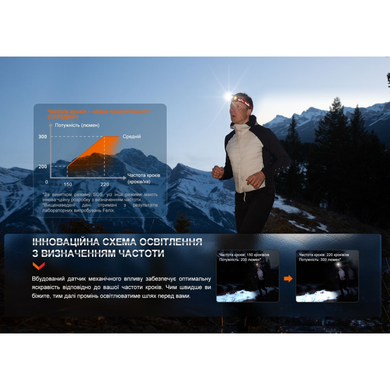 Максимальна яскравість моделі становить 800 люменів, а дальність світла сягає 132 метри. У модель вбудовано датчик, що відстежує частоту кроку користувача та автоматично регулює потужність освітлення залежно від швидкості пересування. Наприклад, при швидкості 150 кроків за хвилину ліхтар світитиме з яскравістю 200 люменів, а у разі прискорення до 220 кроків за хвилину цей показник збільшиться до 300 люменів.