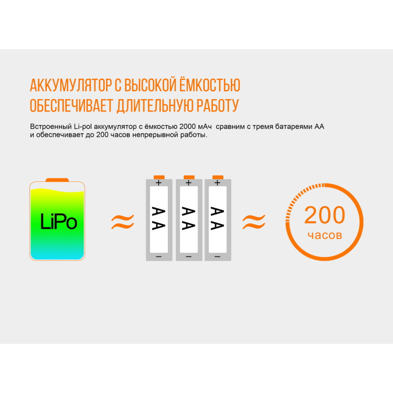 Дана модель налобного ліхтаря працює з якісним вбудованим акумулятором літій-полімерного типу. Він має ємність 2000 ма, що можна порівняти з запасом енергії трьох звичайних батарейок АА. Зарядити акумулятор можна від будь-якого зовнішнього пристрою, якщо підключити ліхтар до нього через кабель з роз'ємами USB і micro-USB. Вбудований індикатор буде повідомляти користувачу про статус зарядки. Один миготливий діод відповідає кількості заряду менше 20%. Один постійно світиться діод і один миготливий – про заряді 20-50%. Два світних і один миготливий діод – 50-80% заряду. Три світяться і один миготливий відповідають рівню заряду 80-95%. Чотири світяться діода – це повністю заряджений акумулятор. Дізнатися рівень заряду при роботі ліхтаря теж можна, але в цьому випадку 4 світяться діода говорять про рівень заряду 80-100%, 3 діода – 60-80%, 2 діода – 40-60%, 1 діод – 20-40%, 1 миготливий діод – менше 20%.