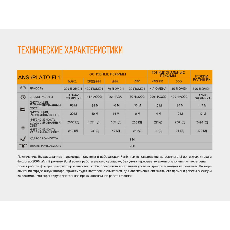 | Яскравість | 300 люмен | 130 люмен | 70 люмен | 30 люмен | 4 люмена | 30 люмен | 600 люмен | |