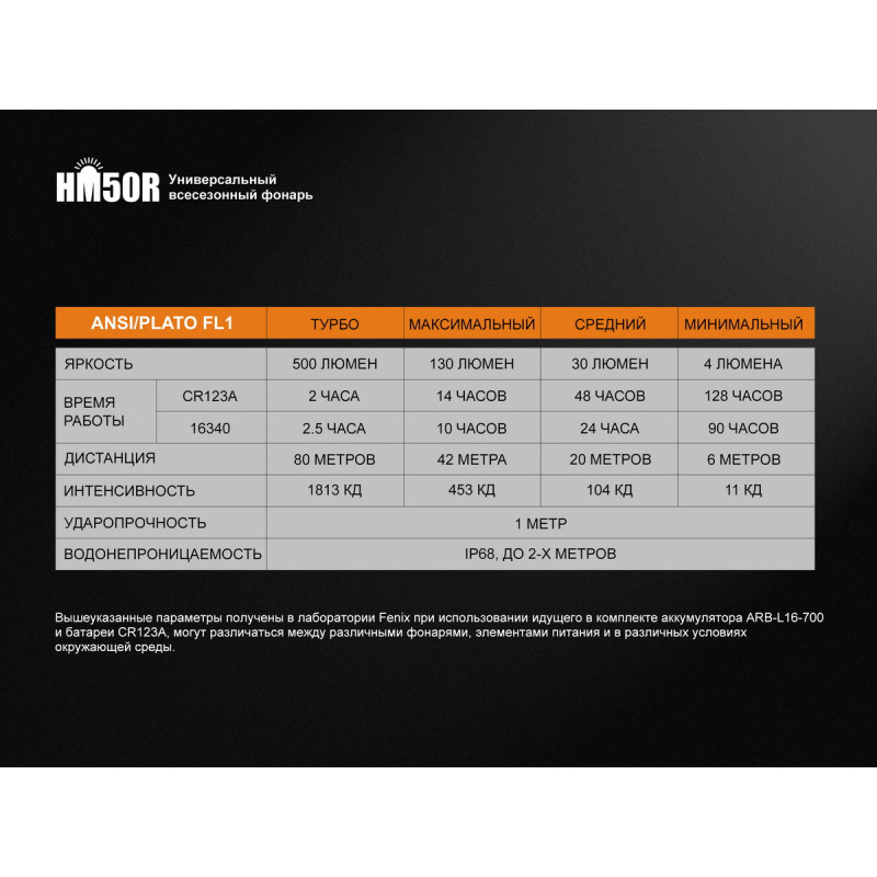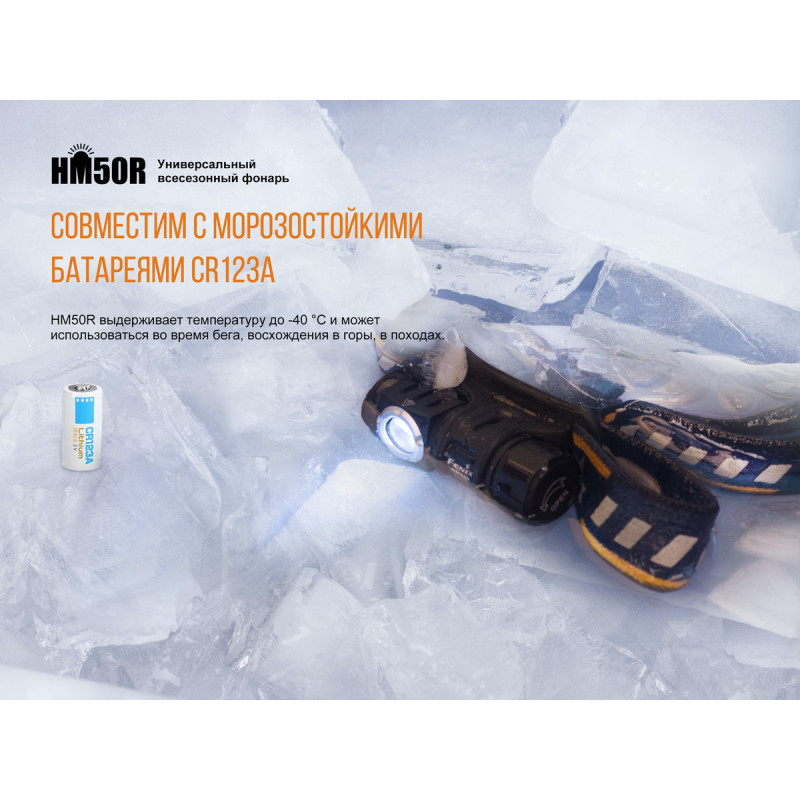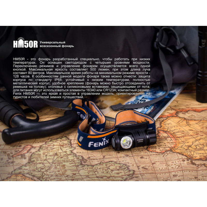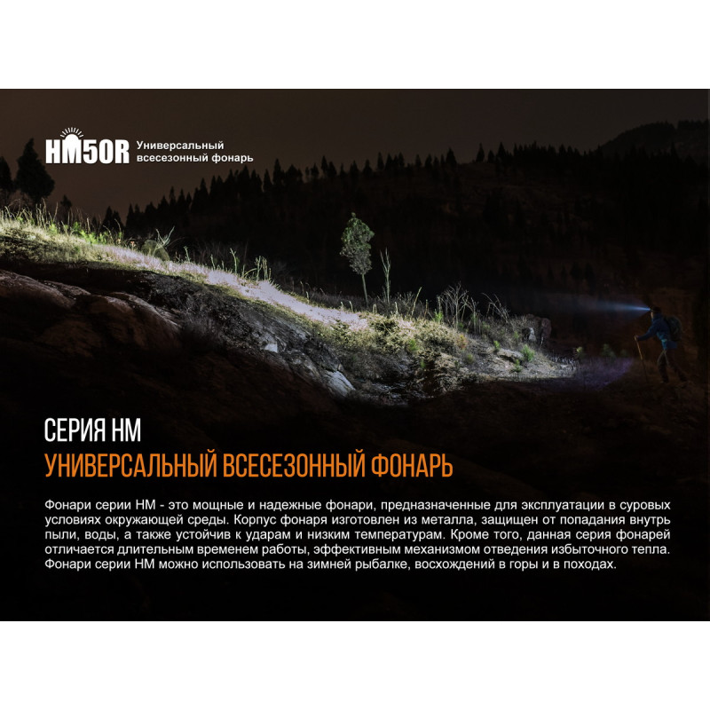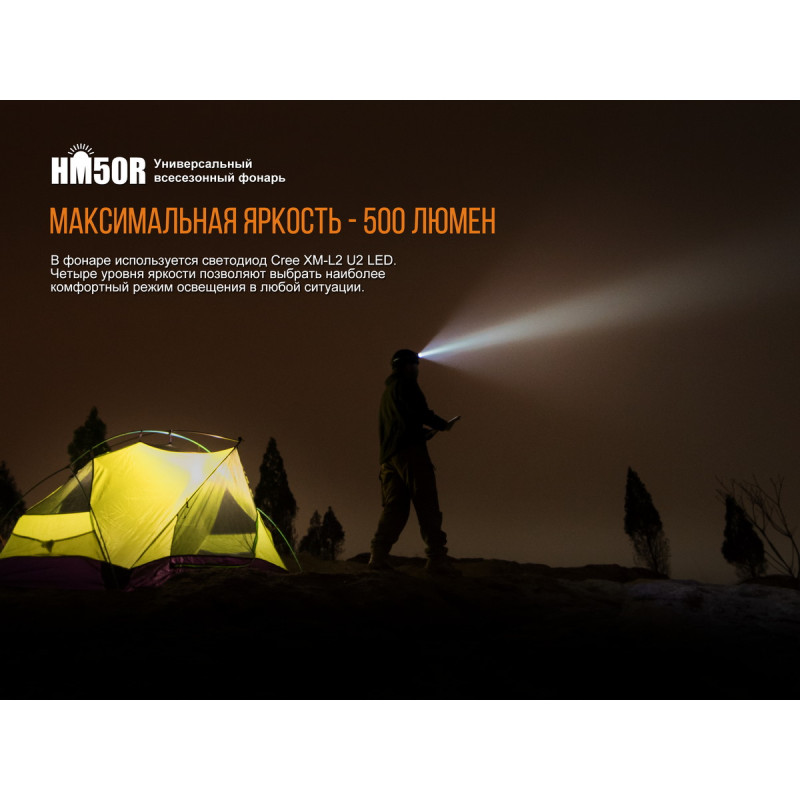 HM50R — вдала модель налобного ліхтаря для поїздів на природу навіть в умовах несприятливої погоди. Цей ліхтар точно підійде альпіністам, спелеологам, туристам, любителям зимових поїздок на риболовлю. Він використовує потенціал світлодіода XM-L2 U2 і може давати світло яскравістю аж до 500 люмен. Ця модель підтримує 4 режиму, кожен з яких відрізняється яскравістю постійного променя. Це може бути 500, 130, 30 або 4 люмена. Від яскравості залежить і дальність променя. Вона варіюється в межах 6-80 метрів. Тривалість використання ліхтаря в автономному режимі залежить від того, який елемент живлення був обраний користувачем. В комплекті вже є акумулятор фірмового виробництва ARB-L16-700 літій-іонного типу. Його при мінімальній яскравості вистачить на 90 годин освітлення. Якщо ж скористатися літієвою батареєю CR123A, то ліхтар зможе працювати до 128 годин.