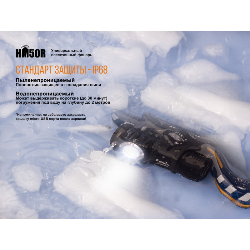 У даній моделі є й інші захисні механізми. В тому числі, HM50R не страшні короткі замикання, ліхтар не схильний до переполюсовке. В якості захисного механізму виступає і оболонка цього ліхтаря. Вона повністю алюмінієва, що наробить HM50R великою міцністю і запобігає розвитку корозії. Водонепроникність і захищеність від пилу у даної моделі найбільш висока, що підтверджується стандарту IP-68. Тому його без проблем можна включати в будь-який час року і абсолютно при будь-якій погоді.
