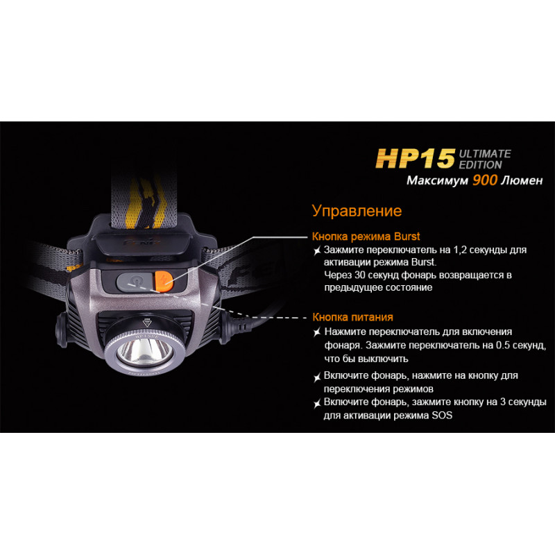 Щоб уникнути випадкового включення освітлювального приладу під час транспортування, виробники забезпечили його спеціальним пластиковим козирком, що захищає від натискання кнопки управління. Управління здійснюється 2 кнопками. Перша з них відповідає за включення/вимикання пристрою, вибір рівня яскравості, а також активацію режиму SOS (при утриманні кнопки натиснутою протягом 3 с). Для включення ліхтаря Fenix HP15 UE у сверхярком режим Burst, призначена окрема кнопка оранжевого кольору.