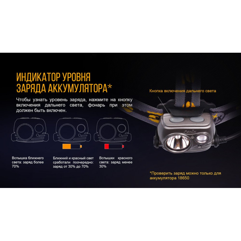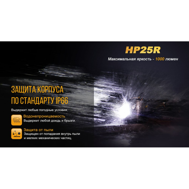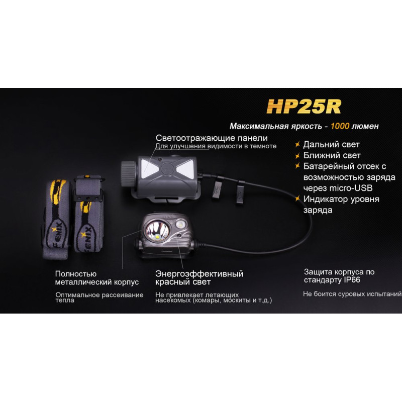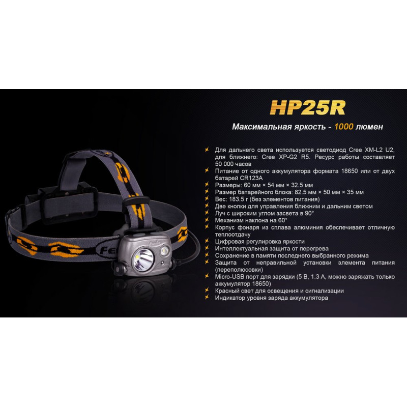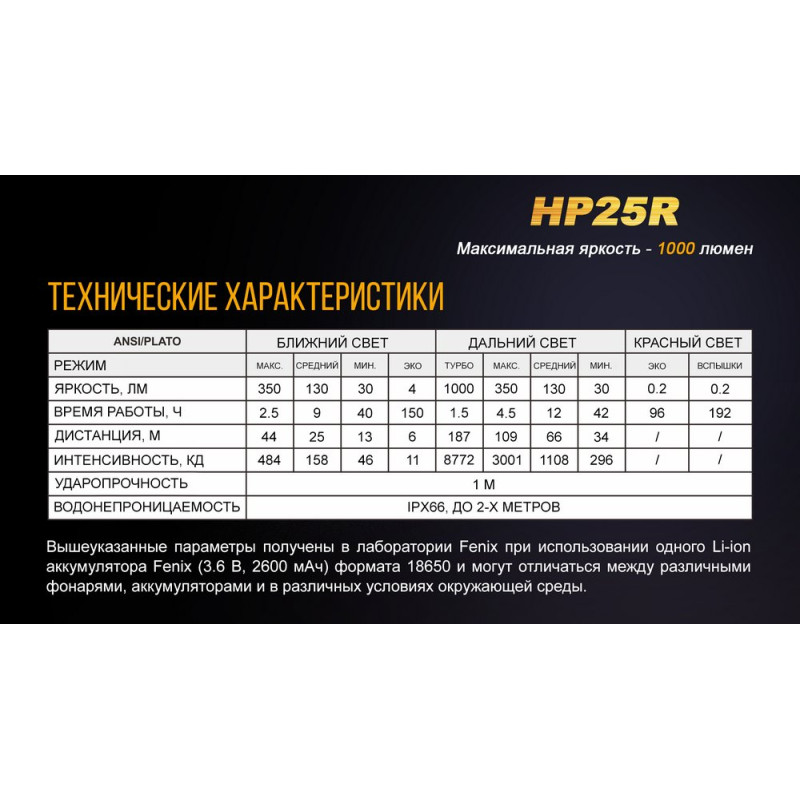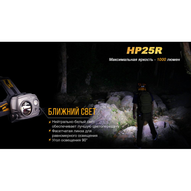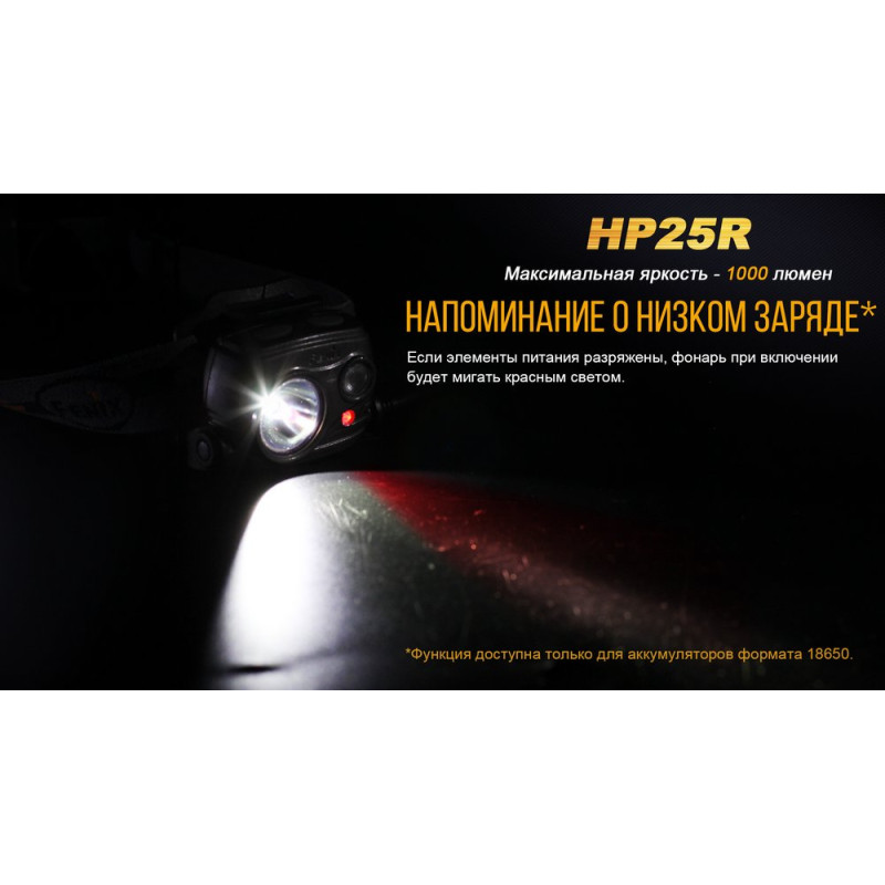 Модель Fenix HP 25R живиться від акумулятора розміру 18650. Він встановлюється в виносний блок, що допомагає не тільки рівномірніше розподілити навантаження, але і в разі необхідності, захистити відсік з акумулятором від холоду або інших небажаних факторів.