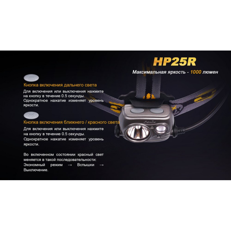 Модель Fenix HP 25R — це зручний налобний ліхтар, який пропонує відмінну якість освітлення. В нього інтегровані відразу три діода, кожен з яких поміщена в окремий рефлектор. Два з діодів відповідають за білий світ: один фокусується на дальній дистанції, а другий дає широкий промінь освітлює ближню територію. Третій діод дає слабке червоне світло для подачі сигналів. Крім того, червоне світло не засліплює людини і тому він не викликає дискомфорту навіть при включенні в повній темряві. Щоб користувачеві ліхтаря було легше орієнтуватися у всіх робочих режимах Fenix HP 25R, яких налічується 10, ці режими розподілені між трьома незалежними групами. За керування дальнім і ближнім світлом відповідають окремі кнопки. В кожній з груп, режими перемикаються циклічно в порядку збільшення яскравості. Червоне світло включається тією ж кнопкою, що і близьке освітлення. Для цього потрібно лише коротко натиснути на неї один раз.