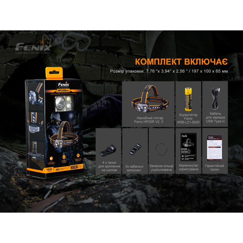 Ліхтар моделі Fenix HP25R V2.0, акумулятор Fenix ARB-L21-5000, зарядний кабель USB Type-C, чотири кріпильних гачка для шолома, три кліпси для кабеля, запасне кільце, керівництво користувача, талон гарантії.