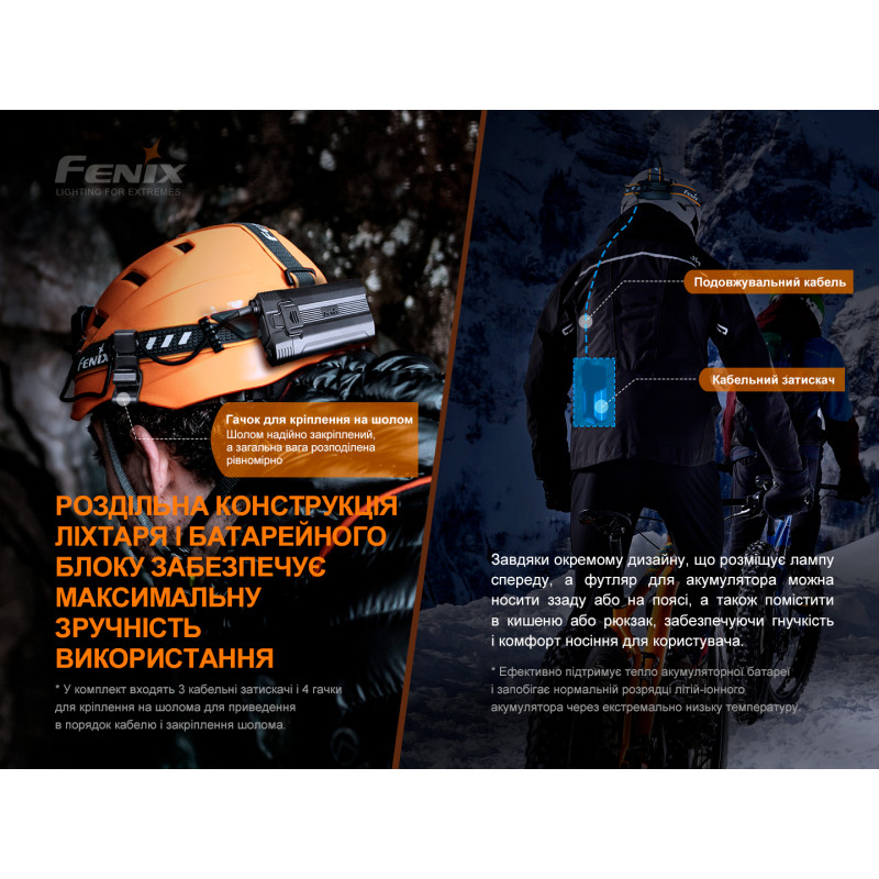 | Комплектація | Ліхтар, 2 акумулятора Fenix ARB-L21-5000 Li-ion, USB Type-C кабель для зарядки, 4 гачки для кріплення на шолом, 3 кліпси для кабелю, кріплення для ременя з нержавіючої сталі, подовжувальний кабель, запасне кільце ущільнювача, інструкція, гарантійний талон. | ||||||||||