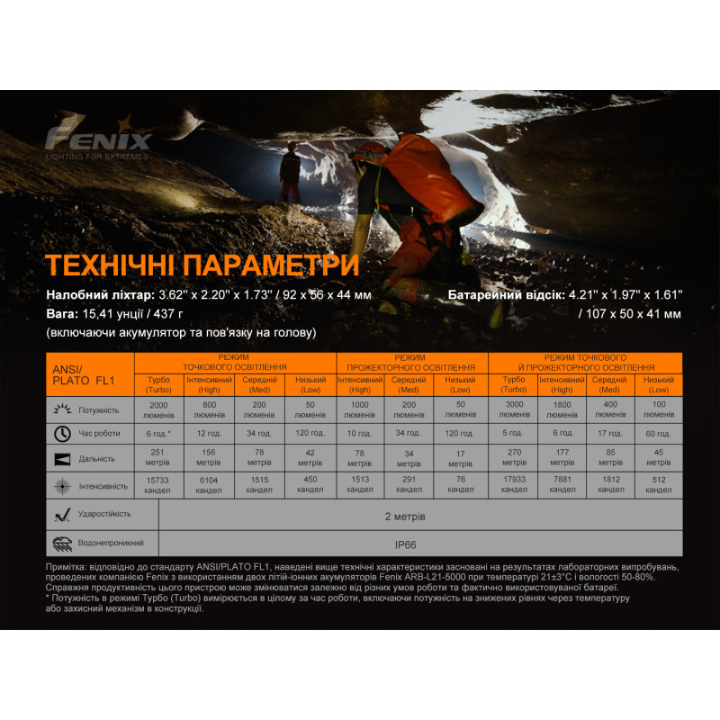 Слід згадати, що наведені вище показники роботи ліхтаря вдалося отримати в ході проведення лабораторних дослідів. Для цього використовували два літій-іонних акумулятора Fenix ARB-L21 - 5000 при температурі 21 + - 3 градуси Цельсія і вологості 50% -80%. Фактичні параметри світіння можуть відрізнятися від зазначених в залежності від використаного акумулятора, а також від умов зовнішнього середовища.