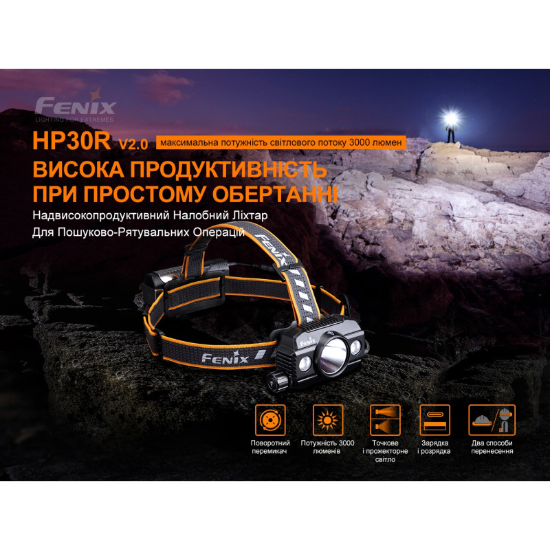 Модель ліхтаря Fenix HP30R V2. 0 являє собою надвисокопродуктивний налобник. Він може застосовуватися в пошуково-рятувальних операціях, також підійде в якості прекрасного помічника для любителів активного дозвілля. Це оновлена версія ліхтаря Fenix HP30R, випущеного раніше. Перезаряджається налобник дає відмінну яскравість світла в 3000 люменів з відстанню дії 270 метрів. Для роботи задіюються відразу три світлодіода: один діод білого освітлення XHP50, два світлодіода нейтрального білого освітлення XP-G3 S4, з терміном експлуатації 50 тисяч годин.