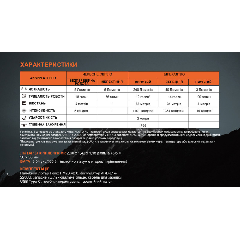 Зверніть увагу! Час роботи у Високому режимі вказано разом із тривалістю світіння на менш яскравих режимах, які послідовно змінюють один одного при спрацюванні захисту від перегрівання.