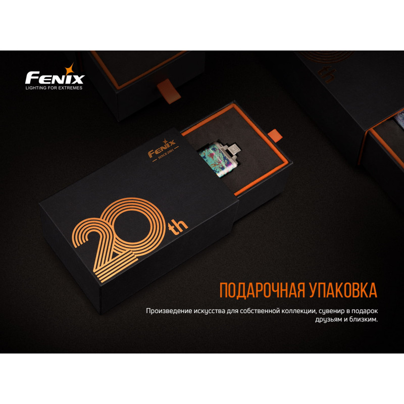 Модель ліхтаря Fenix APEX 20 є спеціальною лімітованою серією ліхтарів. Цей ліхтар випущений з нагоди 20-річного ювілею компанії-виробника. Унікальний ліхтар виконаний зі сплаву титану TC4 і нержавіючої сталі з характерною текстурою. Модель відноситься до категорії EDC – для щоденного застосування. Максимальний світловий потік досягає 760 люменів, а відстань дії променя становить 86 метрів. Освітлення дають два діода: білий світлодіод Cree XP-L HI V2 і червоний світлодіод Cree XQ-E з терміном служби 50 000 годин.