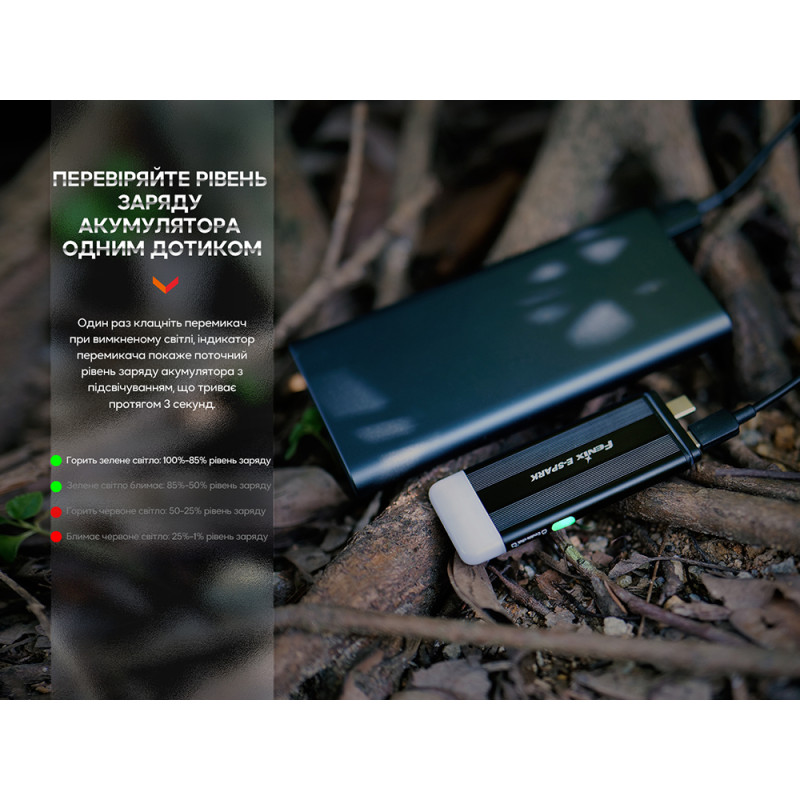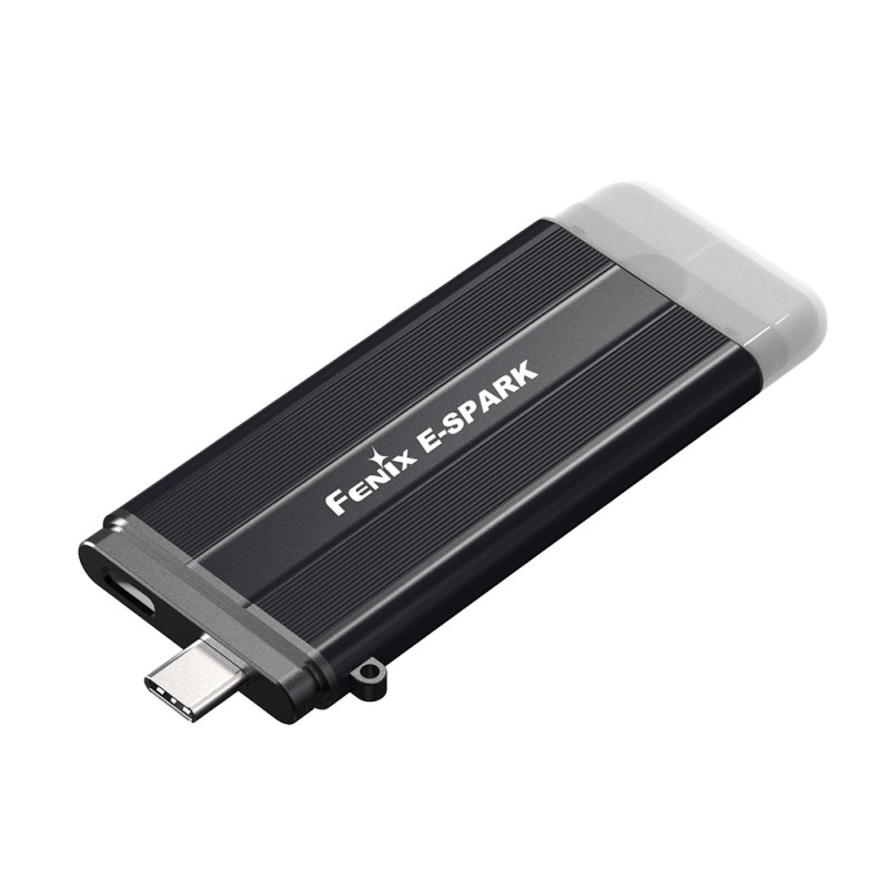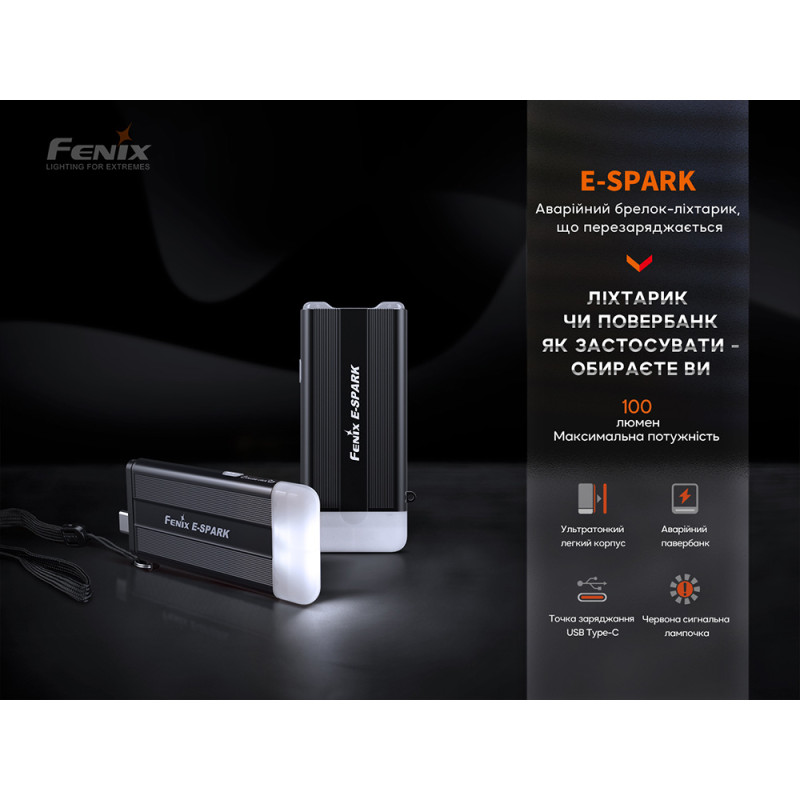 Fenix E-Spark є акумуляторним ліхтарем-брелоком для аварійних ситуацій. Fenix E-SPARK — ліхтар, що перезаряджається, на брелоку з функцією Power Bank. За рахунок вбудованого акумулятора ємністю 800 мАг він гарантує яскравість світла 100 люменів, далекобійність променя становить 30 метрів.