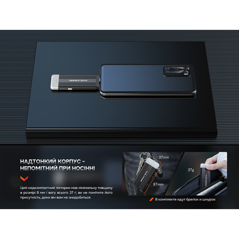 Комплектація: Fenix E-SPARK наключний ліхтар, USB Type-C зарядний кабель, ланцюжок для ключів, темляк, інструкція до застосування, гарантійний талон.