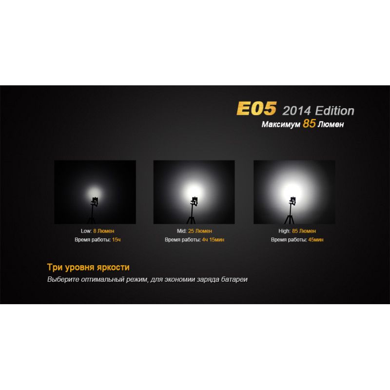 Основою потужності і функціональності Fenix E05 Cree XP-E2 R3 LED (2014 Edition) є вбудований світлодіод Cree XP-E2. Він здатний світити з яскравістю до 85 люмен протягом більше 50 000 годин. Щоб ліхтар можна було налаштувати під індивідуальні запити, в ньому реалізовано 3 режими освітлення: