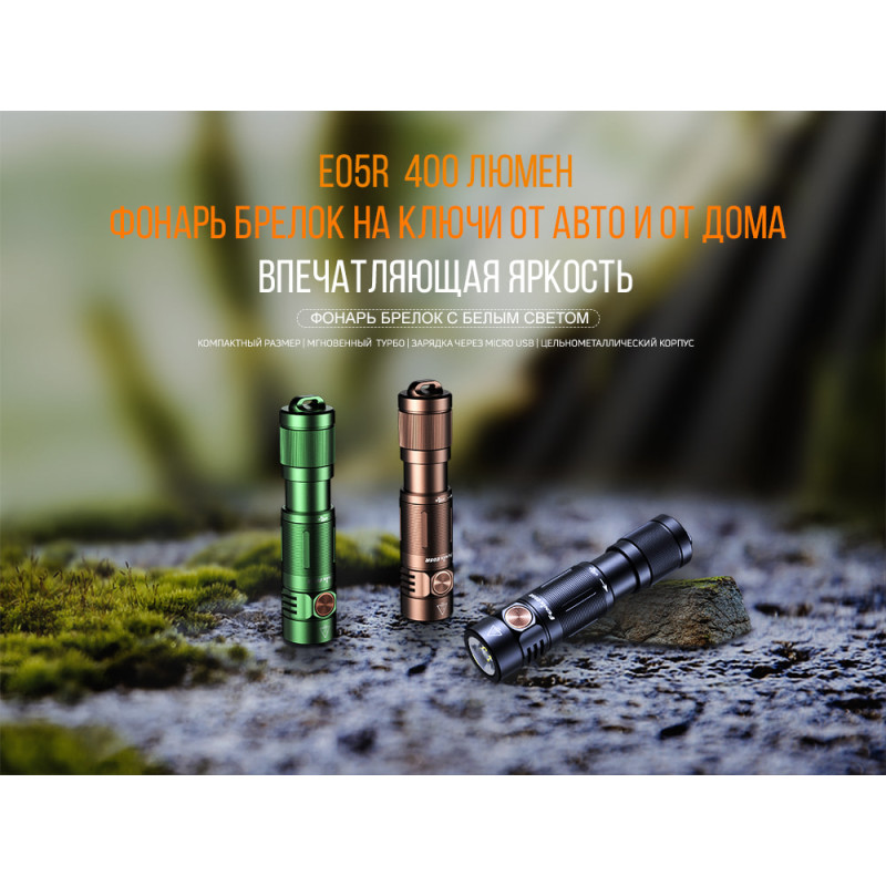 Модель Fenix E05R є компактним і досить легким ліхтарем у вигляді міні-брелка. Одна з цікавих особливостей моделей-те, що корпус ліхтарика йде в трьох різних відтінках. А саме-в чорному, зеленому і бронзовому кольорах. Ліхтар не тільки виконує декоративну функцію, але ще і гарантує Користувачеві найбільший світловий потік в 400 люменів. При цьому відстань дії променя досягає 64 метрів. Для роботи моделі використовується світлодіод Cree XP-G2 S3, біле освітлення. Живлення здійснюється від вбудованого акумулятора Li-polymer ємністю 320 маг.